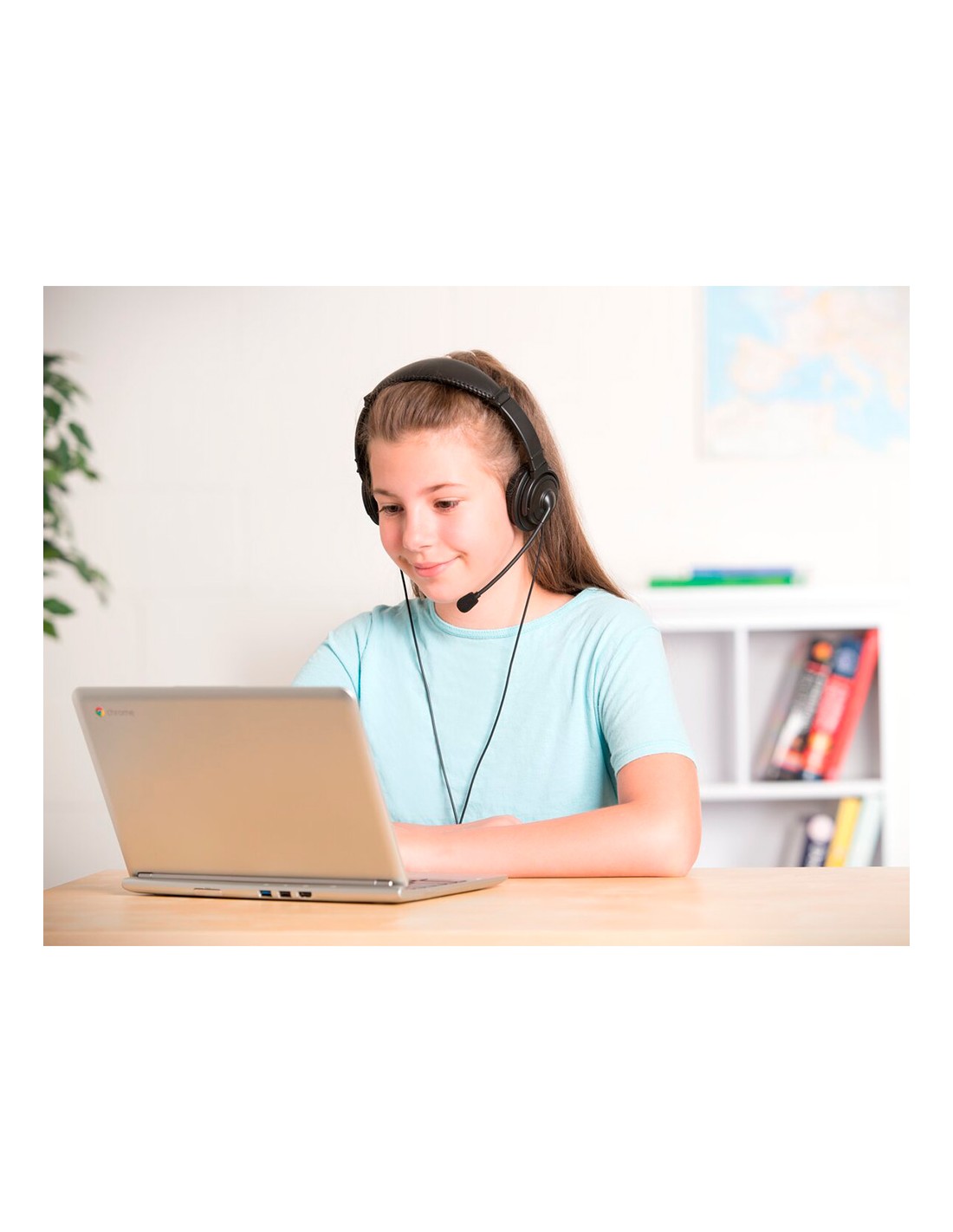 Diadema ajustable y acolchada, el micrófono flexible se puede girar 270 grados y las almohadillas de espuma para los oídos están envueltas en una suave cubierta de cuero sintético para ofrecer confortabilidad. Micrófono con supresión de ruido ambiental que ofrece una voz clara óptima. El cable USB de 182 cm presenta la longitud ideal para entornos de aprendizaje y es resistente como para soportar un uso intensivo. La compatibilidad permite que funcionen con dispositivos Windows, Mac y Chromebook. El límite de sonido seguro establece la salida máxima en 94 db para proteger los oídos de la pérdida auditiva asociada con la exposición a un ruido excesivamente alto.