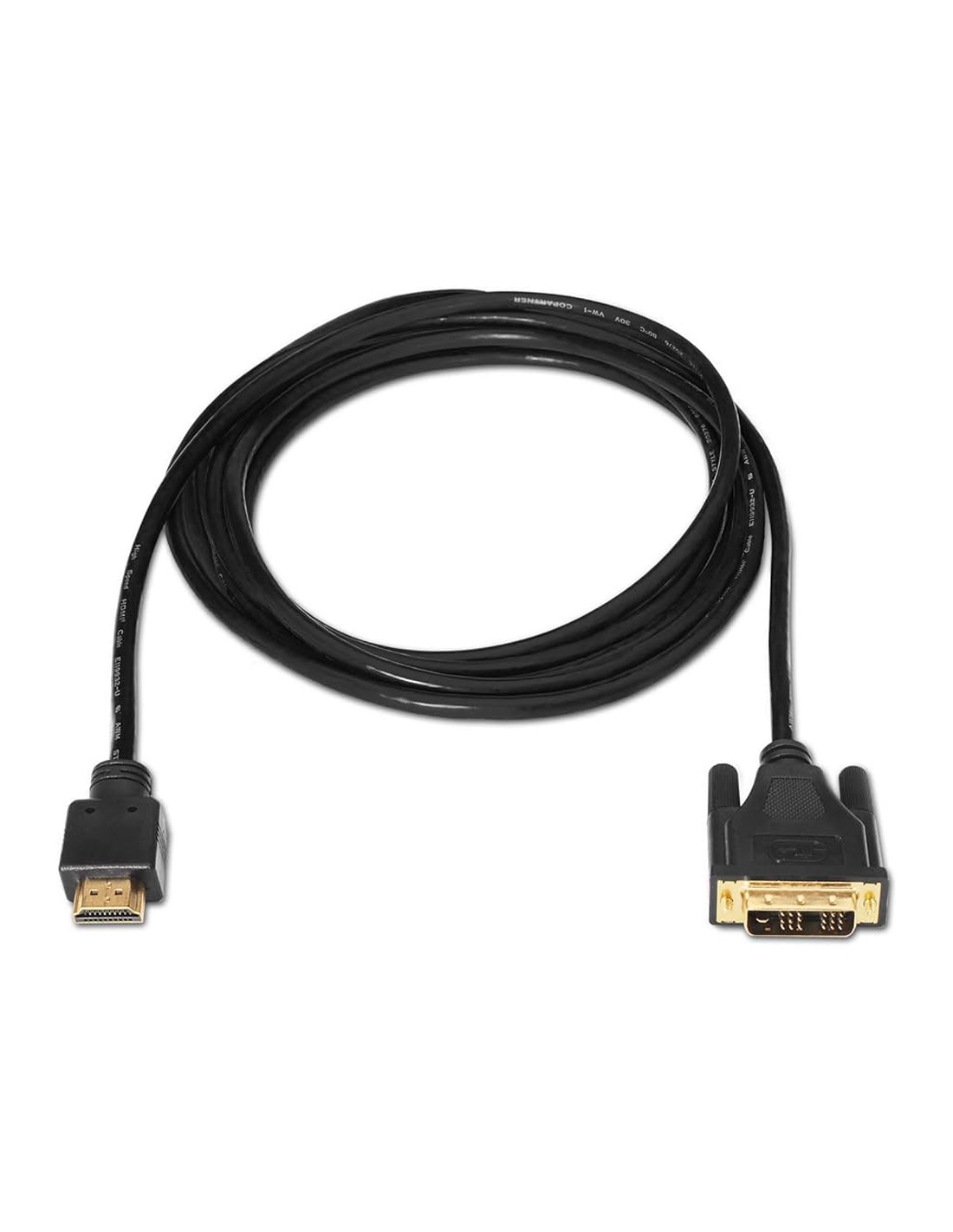 Cable DVI a HDMI con conector tipo DVI 18+1 macho en un extremo y HDMI tipo A macho en el otro. Conector HDMI de alta calidad blindado en oro de 24K. Múltiple apantallamiento formado por 128 hilos trenzados y lámina de aluminio para la máxima reducción de posibles interferencias. Fabricado con conductores de cobre (cobre OFC-Oxygen Free Copper- 99,99%) de alta calidadque garantiza la máxima calidad. Velocidades de transferencias de datos de hasta 5,1 Gb/s.