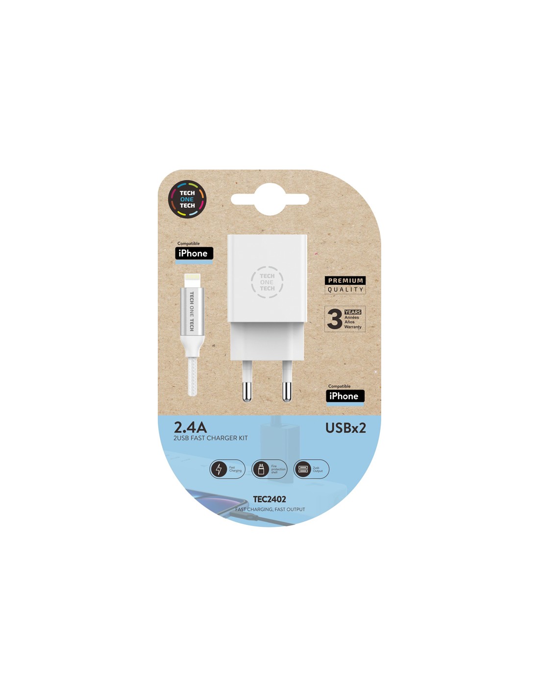 Cargador doble blanco+cable braided nylon lightning (para apple), alto rendimiento2,4ª