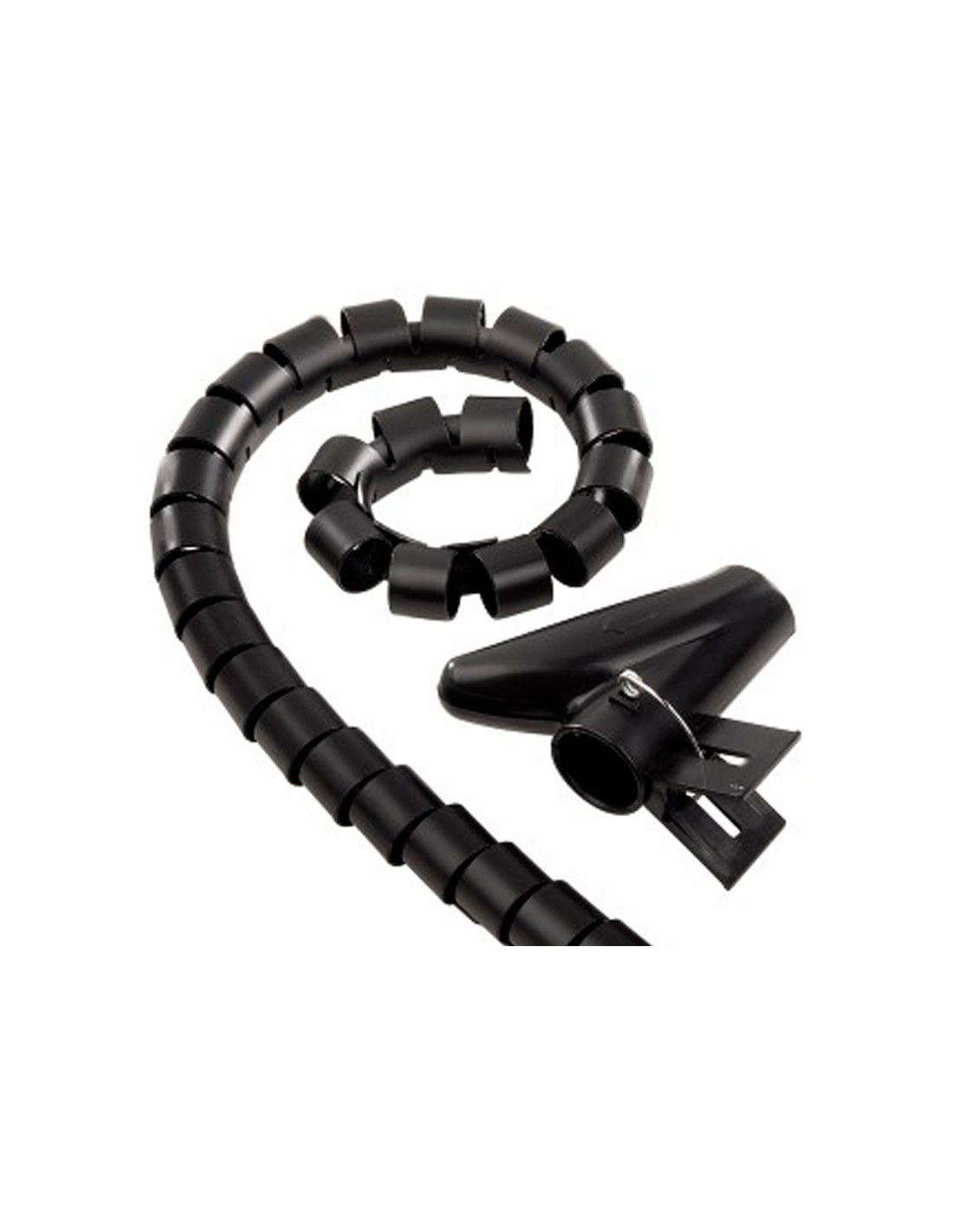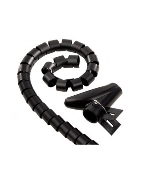 Organizador de cables fabricado en plástico flexible. También sirve para ocultarlos y protegerlos. Se puede introducir o retirar cables fácilmente, y acortar o alargar según la necesidad. Su carácter elástico hace que no se requieran organizadores de cables adicionales para la sujeción. Color negro. Longitud del cable 2,5 m. Diámetro 20 mm.