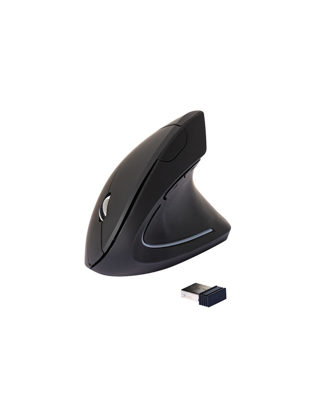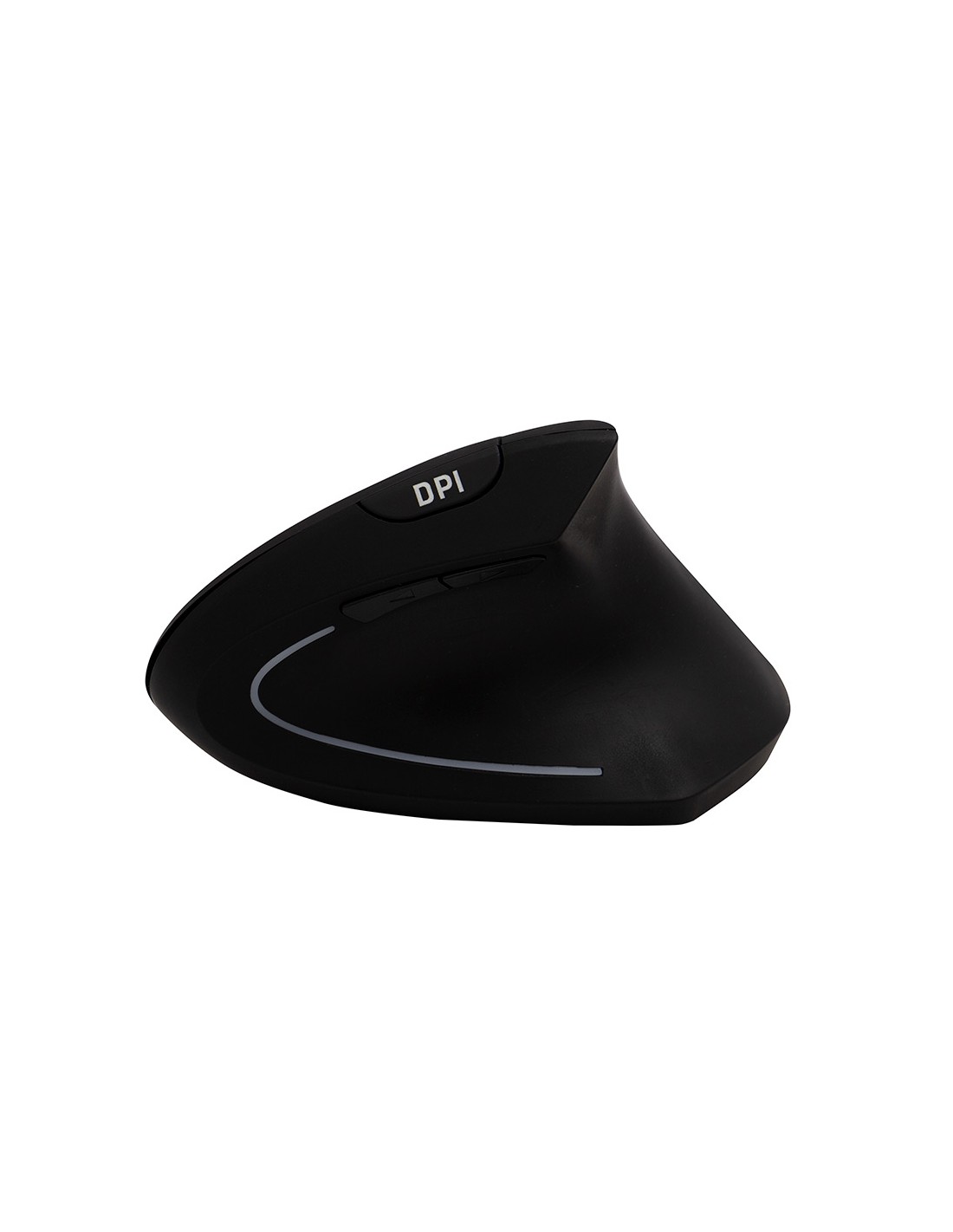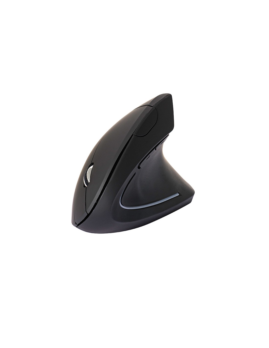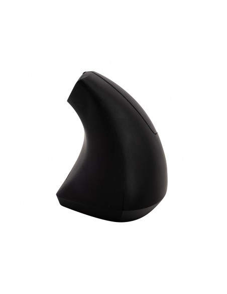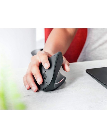 Ratón ergonómico para mano derecha. Ideal para reducir la tensión en muñecas y brazos. Diseño vertical con reposapulgar. 6 botones. Iluminación LED. Sin cable. Funciona con 2 pilas AAA. Pilas no incluidas. Color negro. Medidas 123 mm x 65 mm x 82 mm. Peso 89 g.