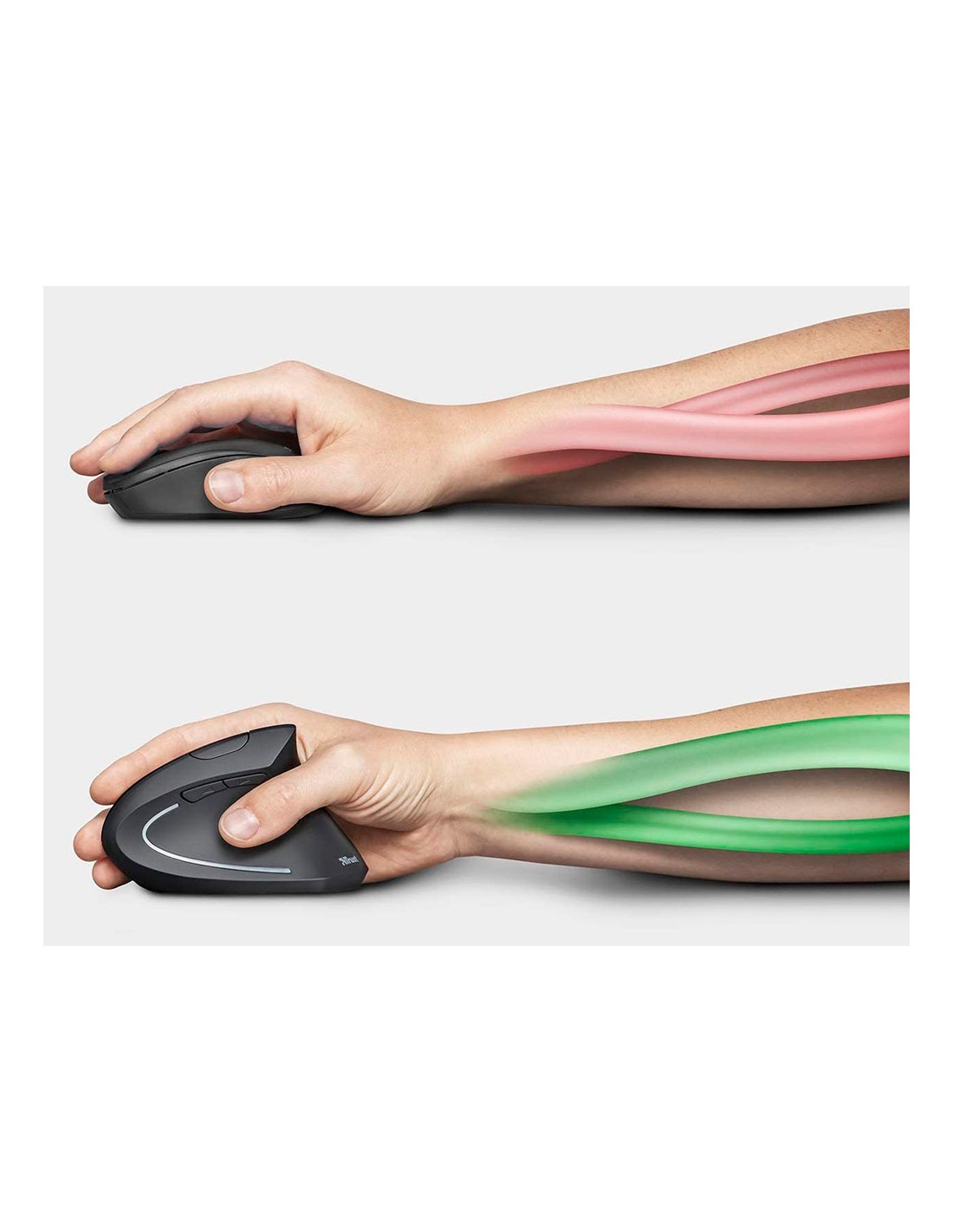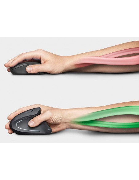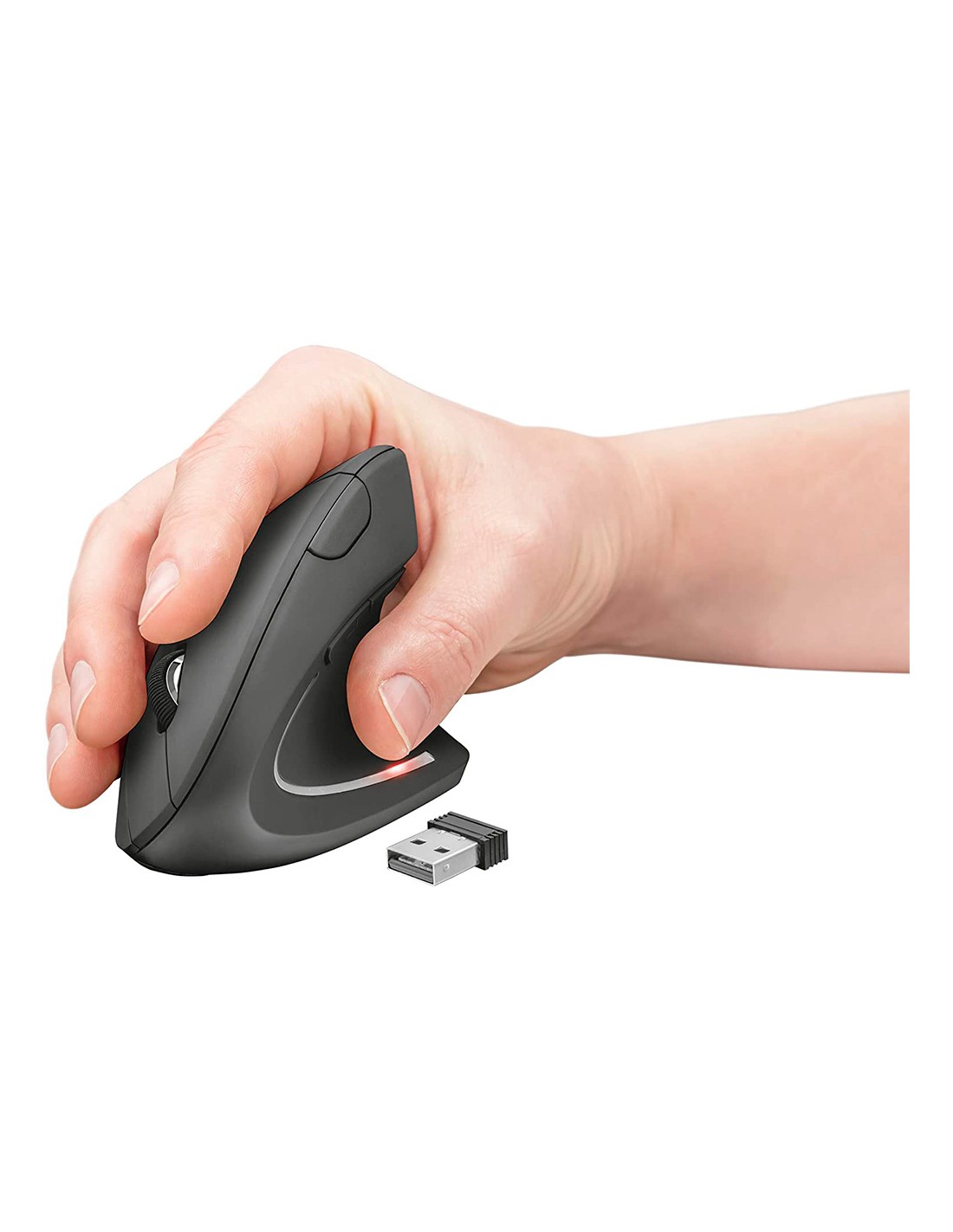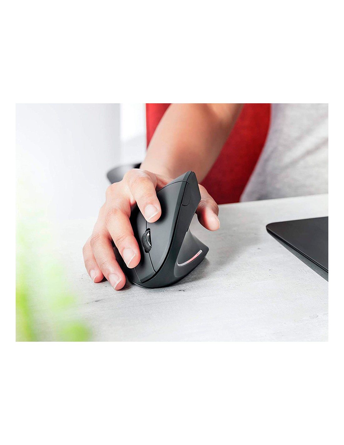 Ratón ergonómico para mano derecha. Ideal para reducir la tensión en muñecas y brazos. Diseño vertical con reposapulgar. 6 botones. Iluminación LED. Sin cable. Funciona con 2 pilas AAA. Pilas no incluidas. Color negro. Medidas 123 mm x 65 mm x 82 mm. Peso 89 g.