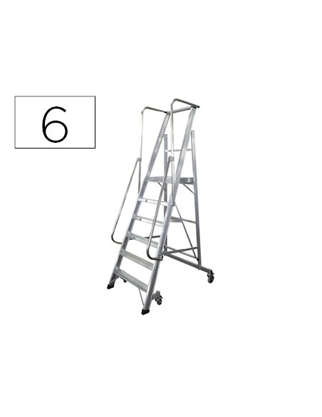 Escalera industrial. Construida con perfiles de aluminio de extrusión con 6 peldaños. Escalones de 8 cm con relieves antideslizantes, atornillados. Altura entre escalones de 25 cm. Plataforma de trabajo de 45 × 45 cm, zócalo y guardacuerpos de 95 cm en aluminio. Pasamanos a ambos lados a partir de 1 m de altura de plataforma. Tirantes de seguridad en aluminio a partir de 6 peldaños. Bandeja para herramientas. Cuatro ruedas giratorias con freno dos delanteras de ø7,5 cm y dos traseras de ø12,5 cm. Grandes tapas finales de PVC antideslizante. Soporta hasta 150 kg. Altura hasta plataforma 140 cm. Altura en tijera 340 cm. Ancho inferior frontal 105 cm. Ancho superior frontal 73 cm. Peso 22 kg.
