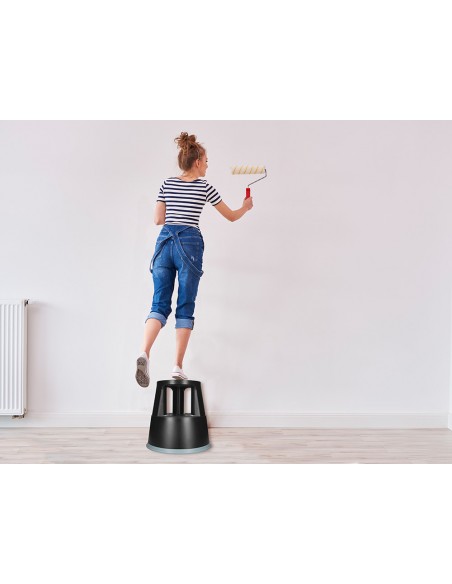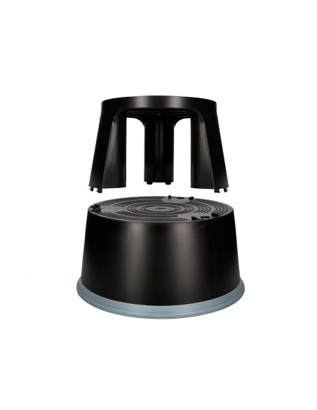 Taburete altamente resistente y firme. Fabricado en ABS. Con ruedas de gomas retráctiles que lo hace muy fácil de transportar y firme a la vez, al permanecer fijo en el suelo. Con dos niveles. Soporta hasta 150 kg. Medidas Ø 43,5 x 43 x Ø 28 cm.