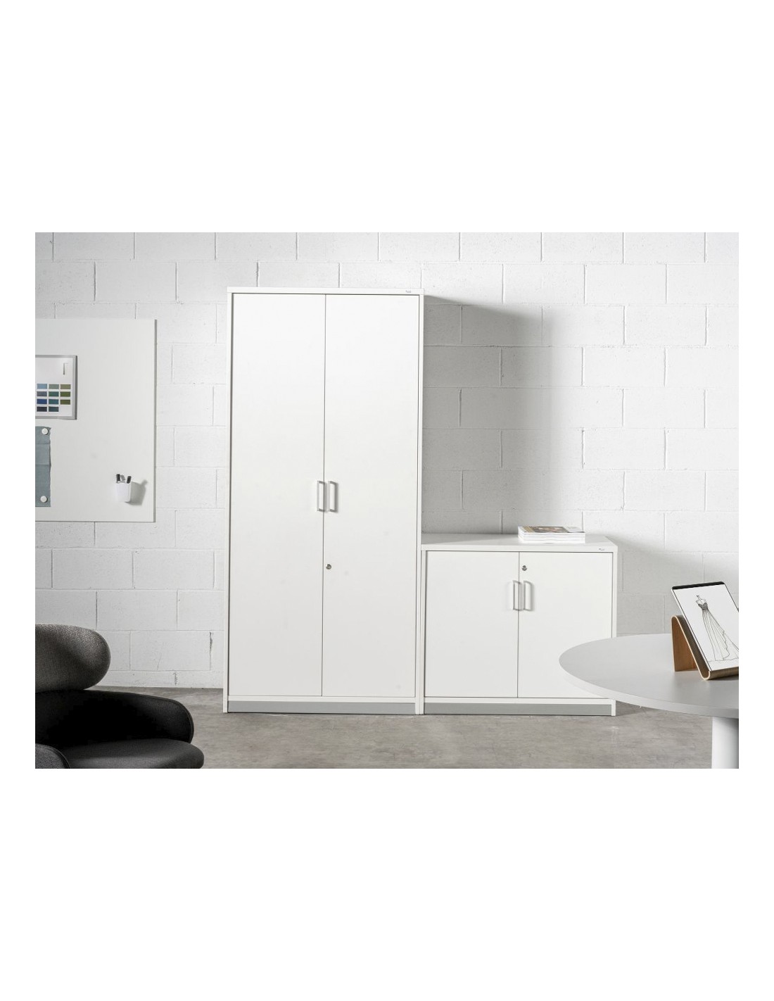 Armario de fácil montaje. Estructura en un 25% acero y un 75% poliestileno. Puertas en polipropileno de 8 mm. Asas y cerraduras con dos llaves incluidas. Capacidad para 9 archivadores de palanca. Cerradura con tapa plegable para ocultarla.
