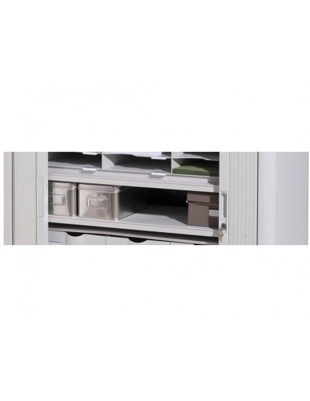 Armario de fácil montaje. Estructura en un 25% acero y un 75% poliestileno. Puertas correderas en polipropileno de 8 mm. Asas y cerraduras con dos llaves incluidas. Capacidad para 9 archivadores de palanca. Cerradura con tapa plegable para ocultarla.