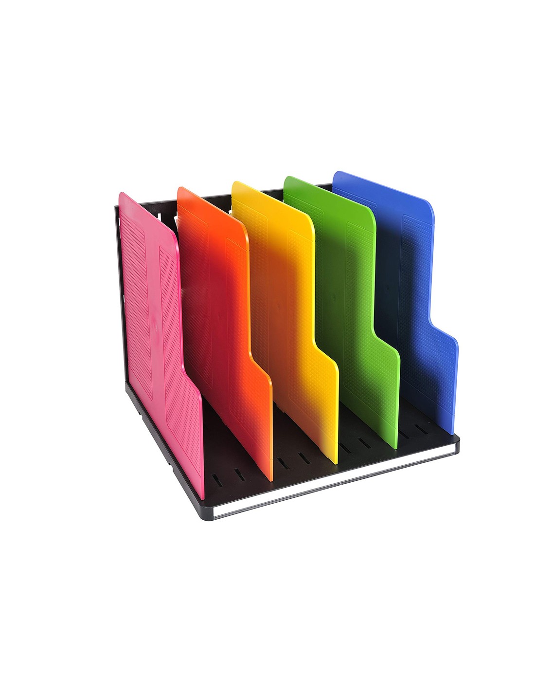 Organizador con 5 separadores. La solución flexible para organizar de manera vertical los documentos DIN A4+. Los separadores se pueden posicionar de manera perpendicular o de manera oblicua. Con una profundidad de 30 cm y con anchura de 29 cm, es compatible con todos los armarios de archivos. También se puede usar solo en una mesa. Medidas 28,8 x 25,5 x 30 cm.