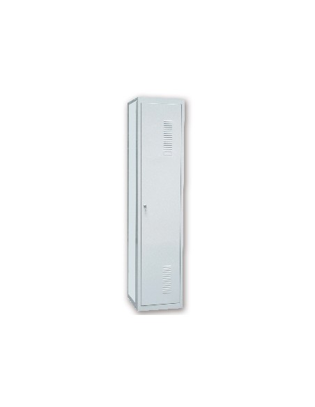 Taquilla metálica de 1 puerta de estética moderna y gran capacidad, perfecta para industrias y colectividades. Fácil montaje Pintura Epoxi RAL 7035 (Gris perla). Cerradura con llave incorporada. Portaperchas. Rejilla de ventilación. Portaetiquetas. Medidas 30 x 180 x 50 cm.