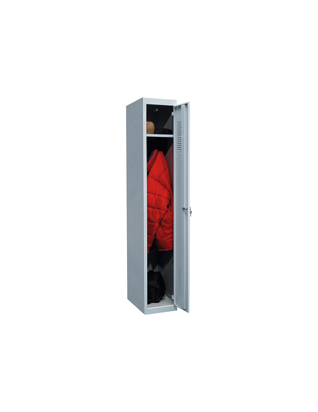 Taquilla metálica de 1 puerta de estética moderna y gran capacidad, perfecta para industrias y colectividades. Fácil montaje Pintura Epoxi RAL 7035 (Gris perla). Cerradura con llave incorporada. Portaperchas. Rejilla de ventilación. Portaetiquetas. Medidas 30 x 180 x 50 cm.