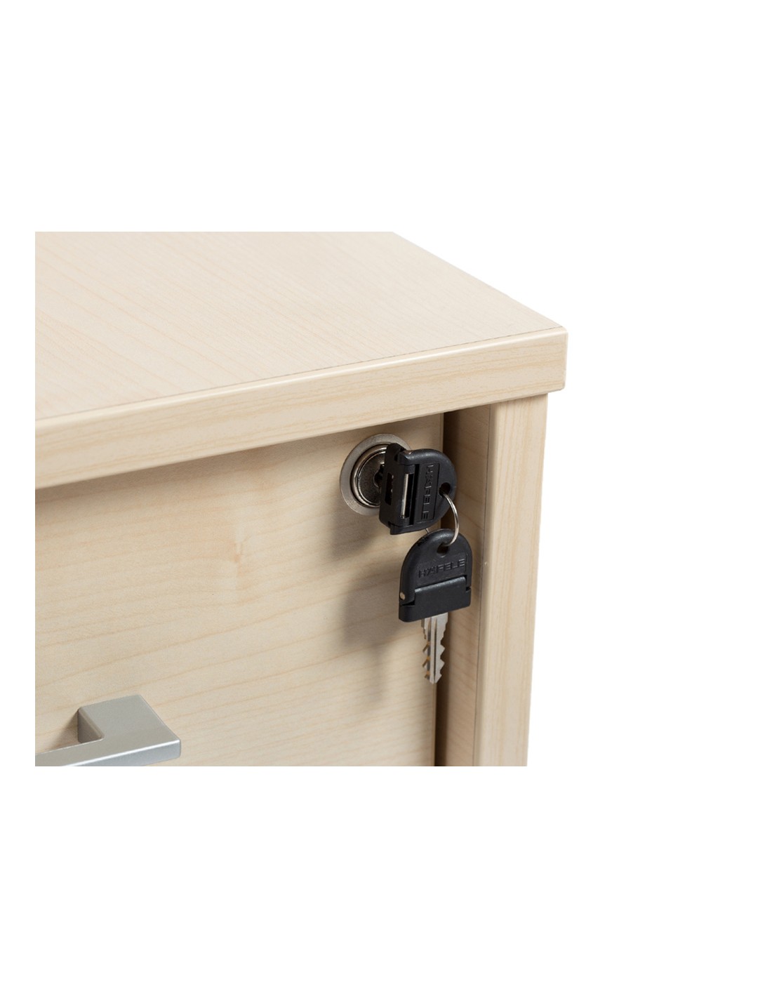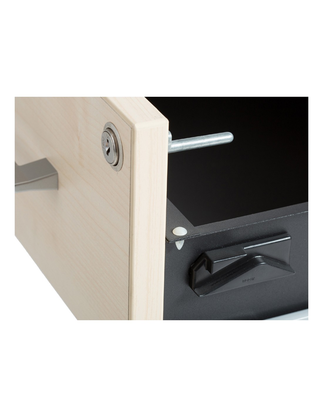 Estructura de melamina de 25 y 19 mm de grosor con canto de PVC de 2 mm. Tiradores metálicos con acabado aluminio. Sistema de cierre con cerradura y sistema antivuelco para cada uno de los cajones. La tapa superior y los frontales de cajones pueden ser en dos acabados distintos haya y gris.