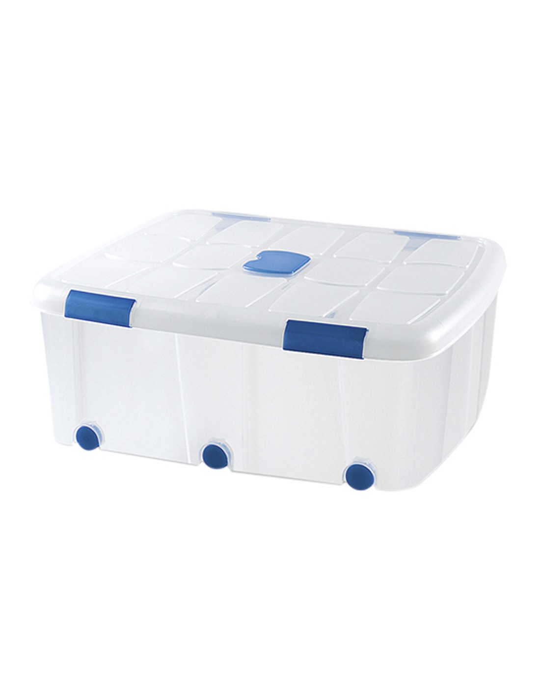 Caja de plástico para ordenación con ruedas y polillero. Indicada especialmente para guardar calzado, ropa, sábanas, mantas y cualquier producto textil y de armario. Son perfectas para guardar la ropa de temporada gracias a su polillero para producto antipolillas, además sus ruedas facilitan el cambio de armario. La tapa con cierres a presión ayuda a la conservación y aislamiento de las prendas.