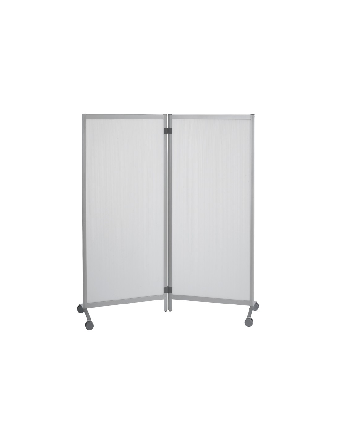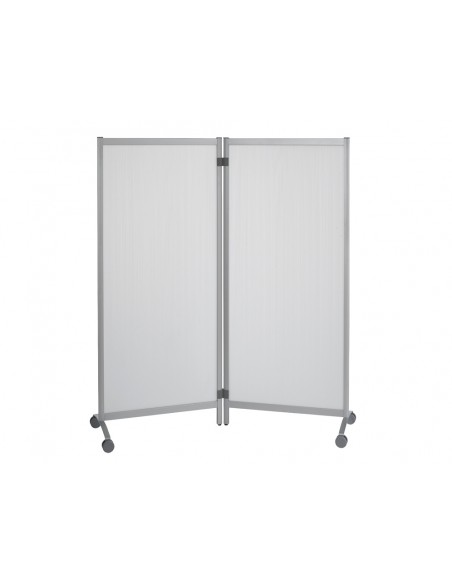 Mampara translúcida con 2 paneles en polipropileno y estructura de aluminio. Equipada de un pie fijo y de un pie móvil con ruedas. Geometría variable. Unidas con 4 clips de conexiones. Medidas 76 + 76 x 170 x 44 cm. Peso 19 kg.