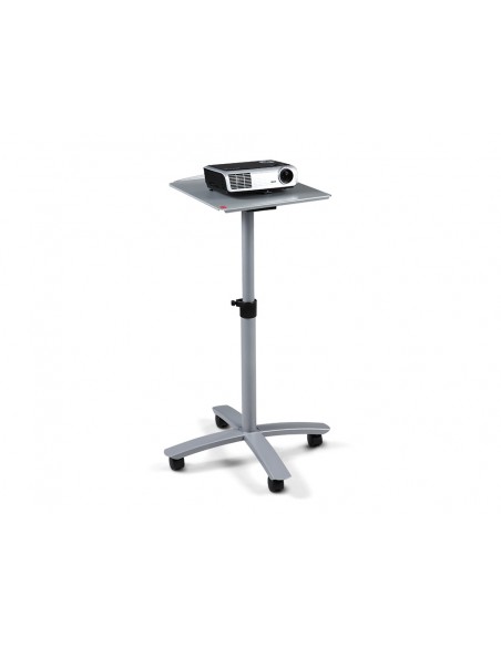 Cuerpo de acero plateado. Regulable en altura de 80 a 120 cm. La plataforma gira y se regula en inclinación. Peso máximo soportado 10 kg. Equipada con 4 ruedas en estrella, 2 de ellas con freno. Medidas de la plataforma 38 x 43 cm.