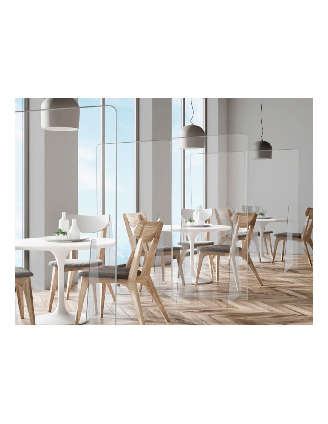 Ideales para su uso en fábricas, oficinas, restaurantes, hoteles, peluquerías y todo tipo de comercios, evitando el contacto directo de trabajadores y clientes. Mampara de pie. Fabricada en acrílico. Perfecta visibilidad a ambos lados de la mampara de protección. Estructura rígida y resistente a golpes. Rápida instalación y limpieza. Metacrilato transparente, incluye dos peanas de 300 x 650 mm que garantizan su estabilidad tota. Estructura rígida, ligera y extra resistente de rápida instalación. Superficie no porosa que permite su desinfección de una forma muy sencilla y segura. Limpiar solo con agua y jabón, no permite utilizar lejía o alcohol. Alto brillo y perfecta visibilidad a ambos lados de la mampara de protección.