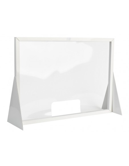 Pantalla de protección con perfil de cartón. Ligera pero estable. Ideal para el intercambio de documentos o pequeños objetos gracias a la ventana central inferior. Incluye dos peanas para una estabilidad más segura. Limpiar sólo con agua y jabón. Disponible en dos posiciones. Medidas de la ventana 30 x 15 cm.