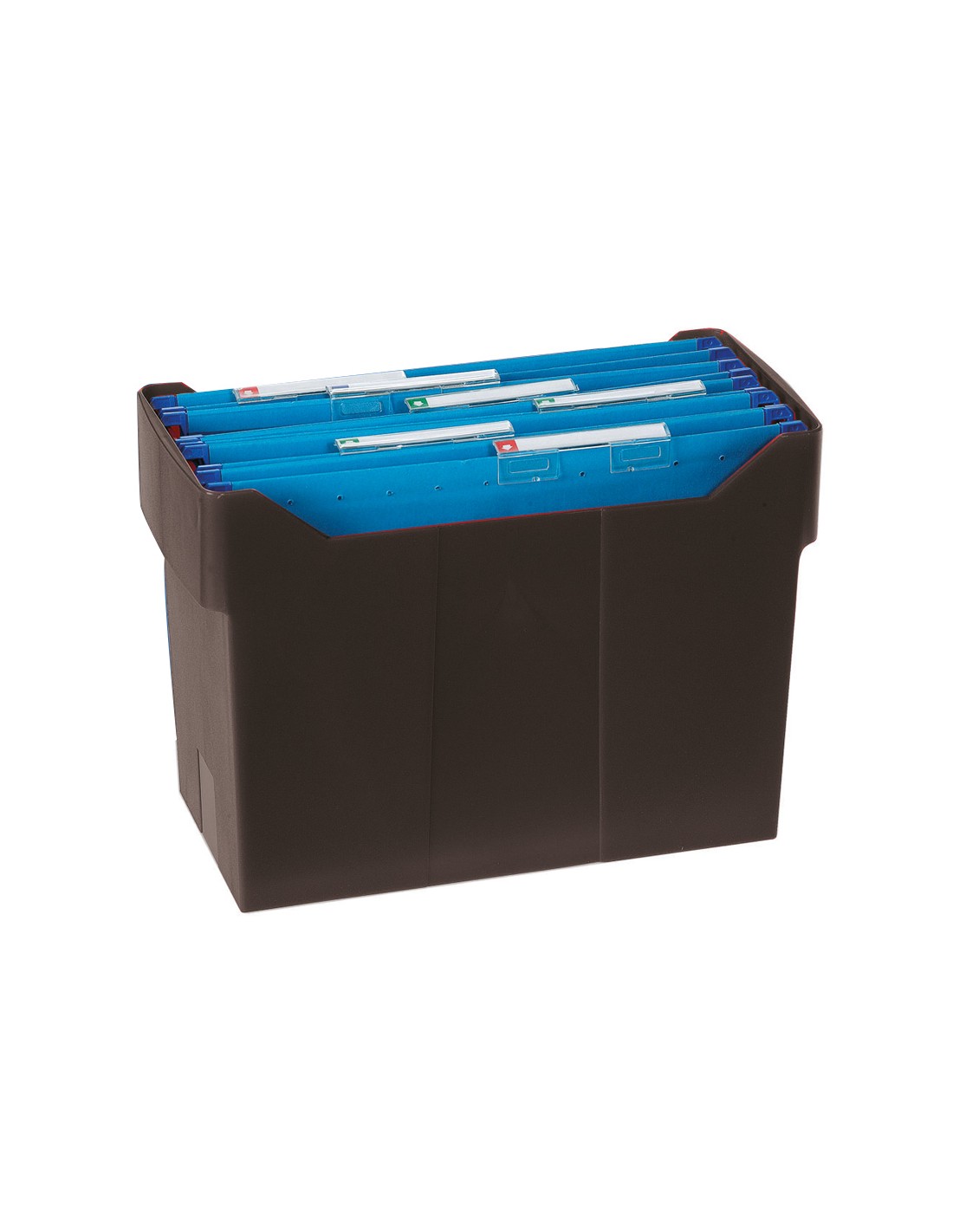 Cajetín de archivo para carpetas colgantes formato DIN A4 visión superior. Inyectado en poliestireno de gran resistencia. Su diseño con asas laterales permite el archivo de 20 carpetas colgantes. No incluye carpetas. Medidas 365 x 260 x 170 mm.