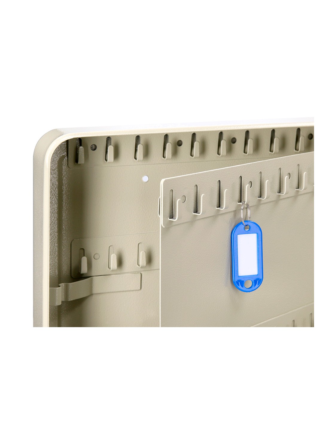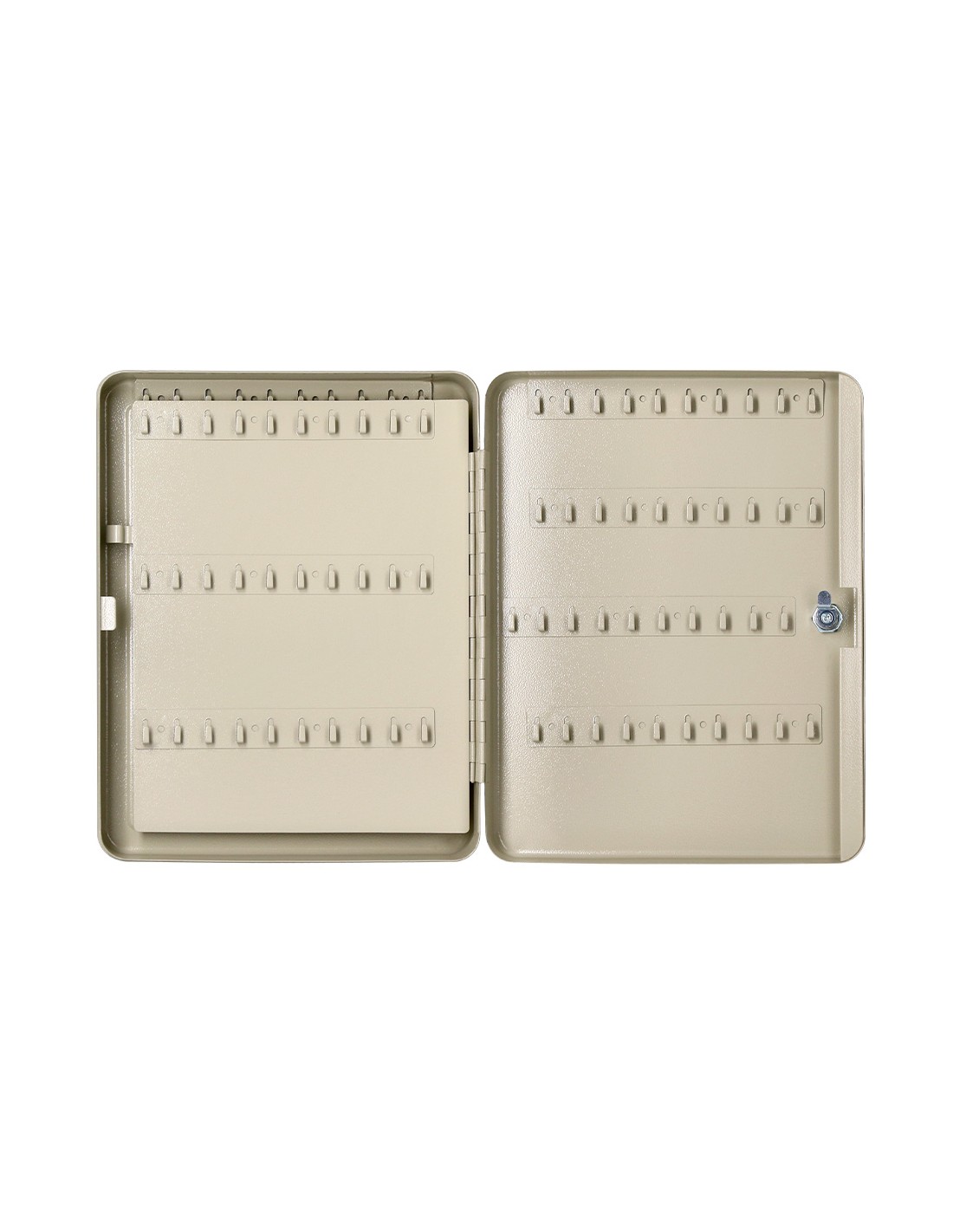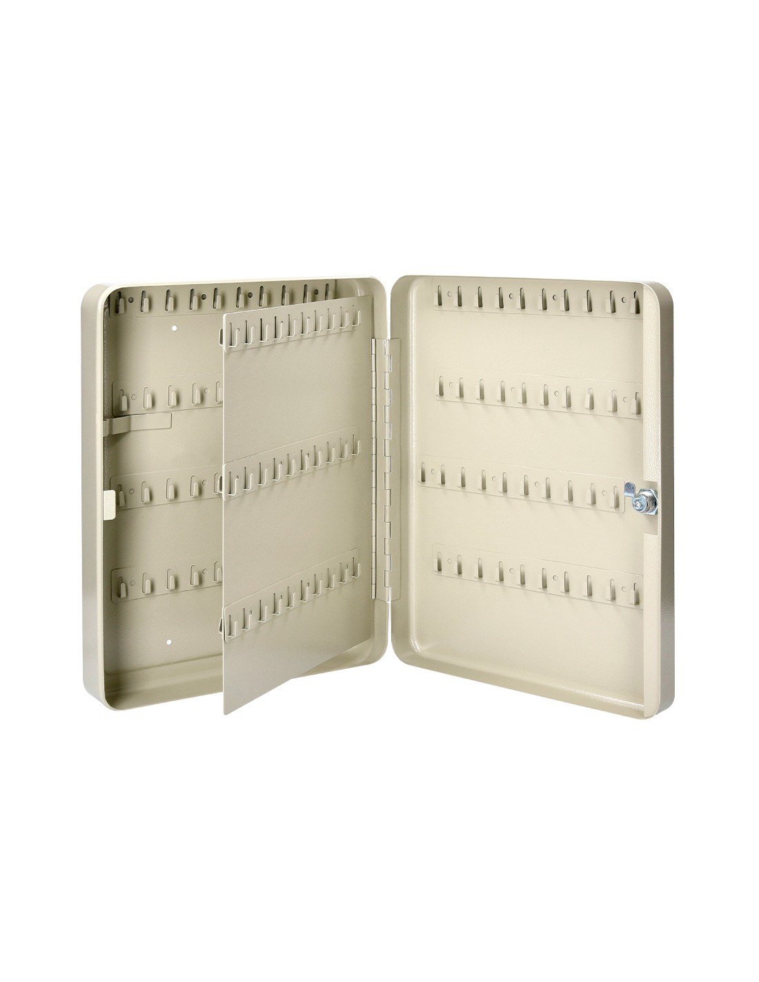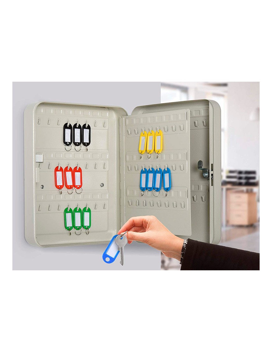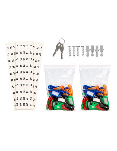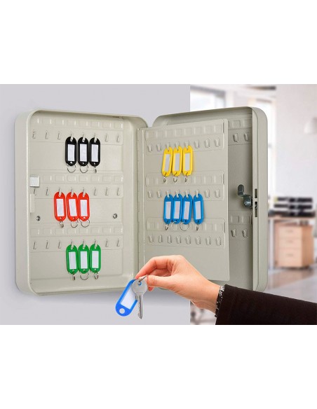 Armario portallaves. Fabricado en acero muy resistente. Incluye dos llaves, llaveros, listados de llaves y accesorios necesarios para fijarlo a la pared y varios paneles para colgar llaves. Estructura de acero de 0,8 cm de espesor.