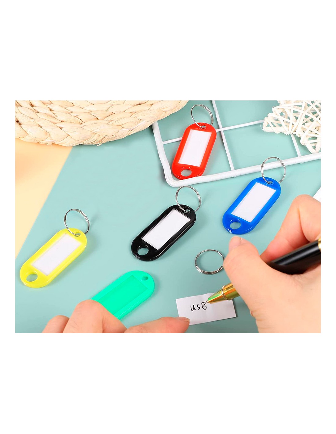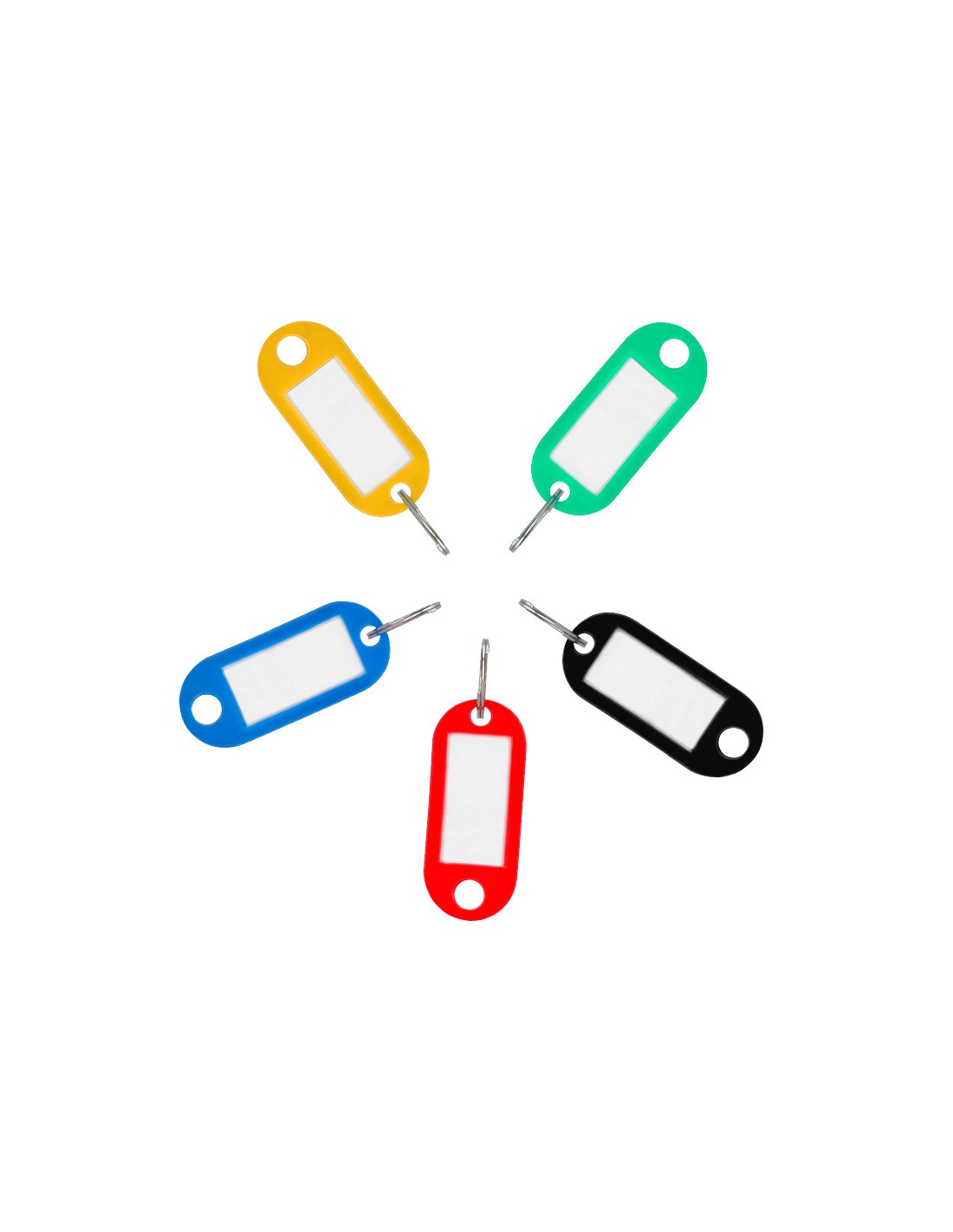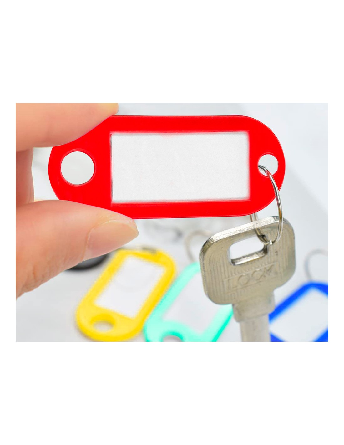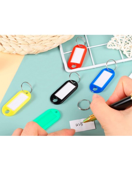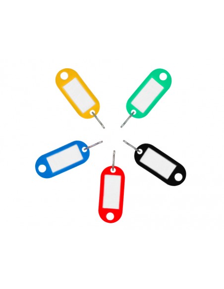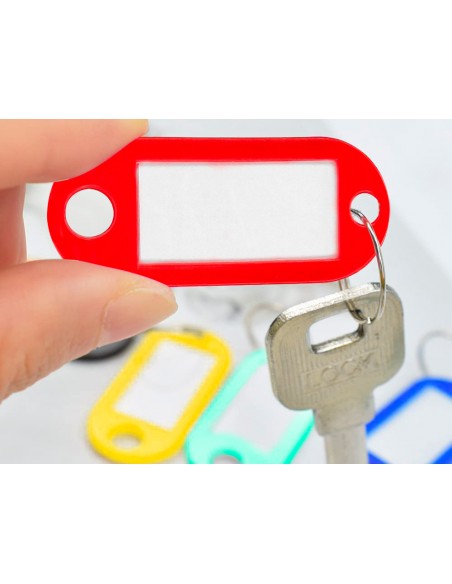 Llaveros con útiles portaetiquetas para indicar la información de la llave. Fabricado en plástico reciclado. Colores surtidos. Medidas 50 x 22 mm. Presentados en caja de 100 unidades.