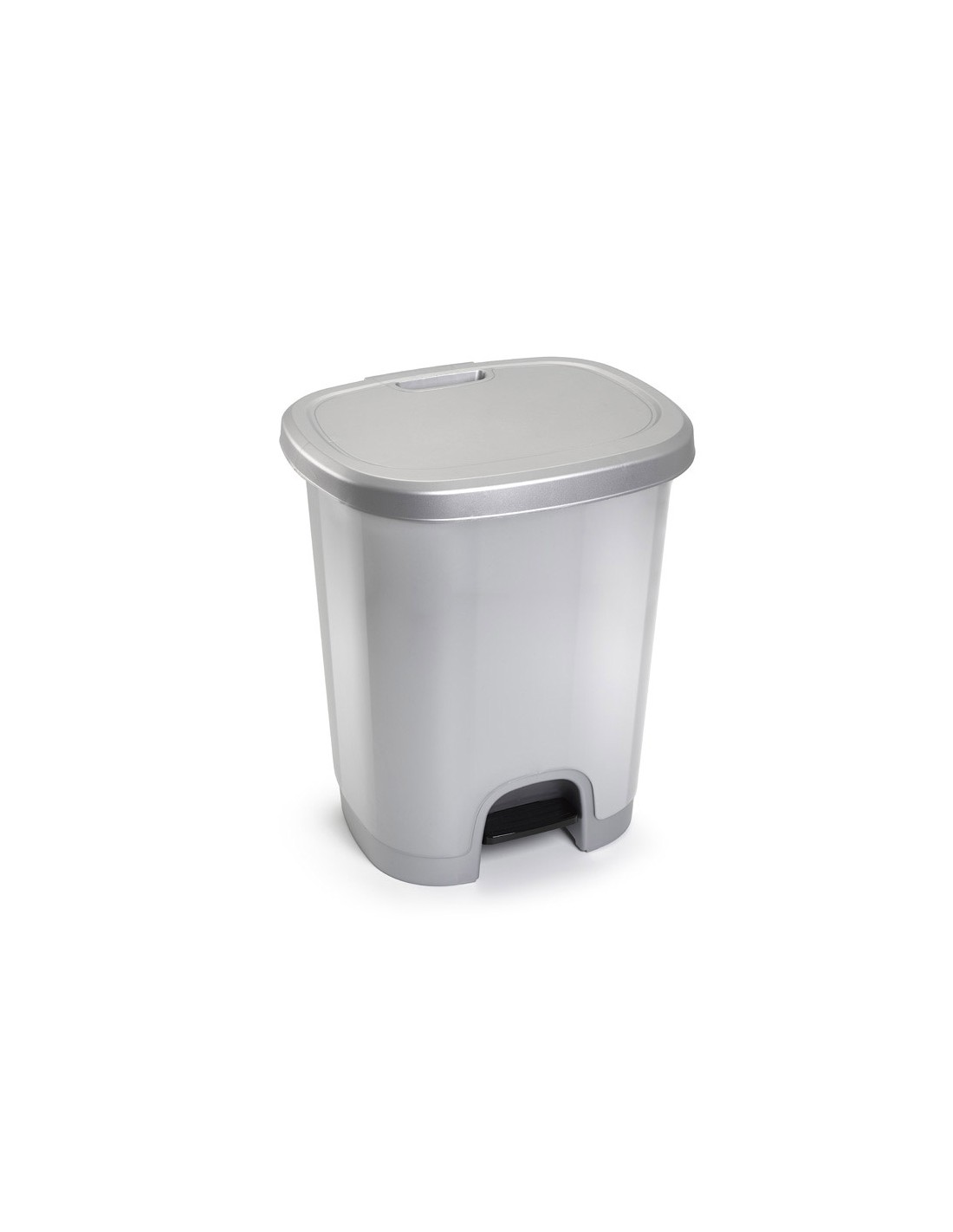 Cubo con pedal. Diseño actual y sencillo. Gracias a su pedal, evita el contacto con las manos. Es duradero y resistente, fabricado en plástico fácil de limpiar. Fabricado en España. Color plata.