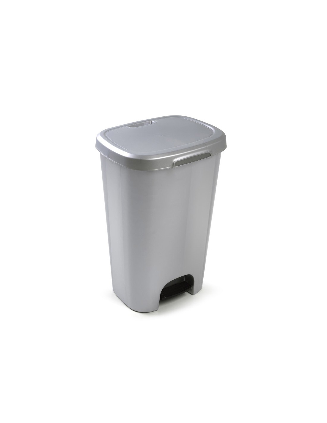 Cubo con pedal. Diseño actual y sencillo. Gracias a su pedal, evita el contacto con las manos. Es duradero y resistente, fabricado en plástico fácil de limpiar. Fabricado en España. Color plata.