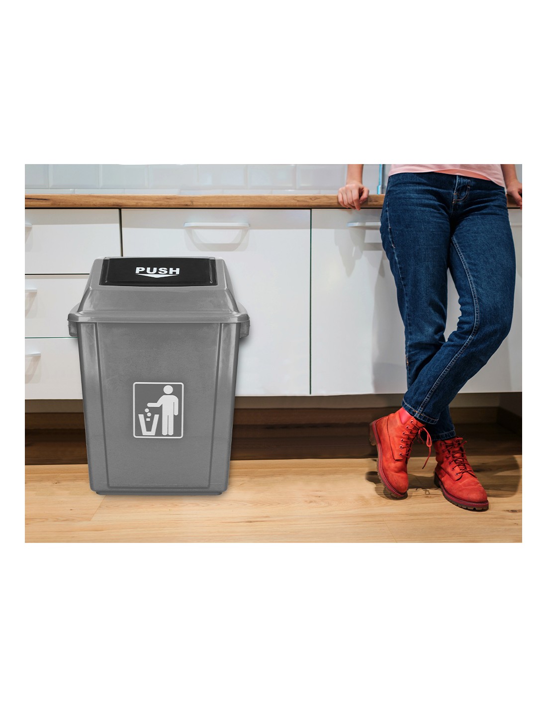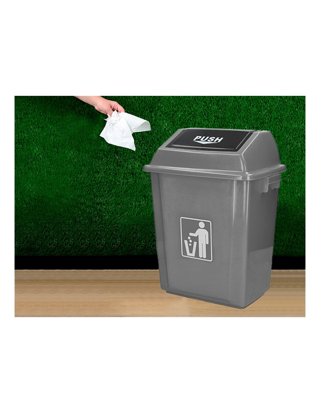 Con tapa balancín. Fácil apertura para retirar la bolsa. 2 asas para facilitar el transporte. Fabricada en plástico. Resistente. Color gris.