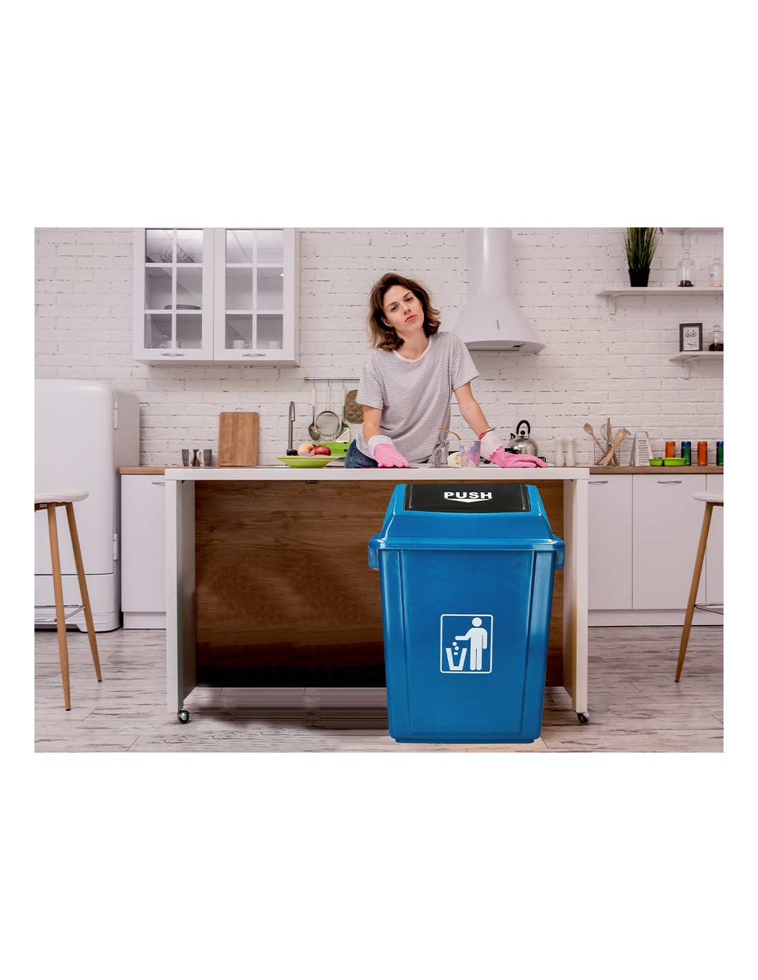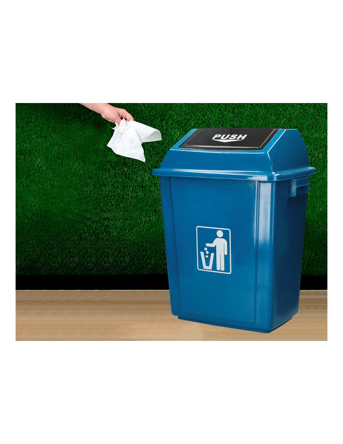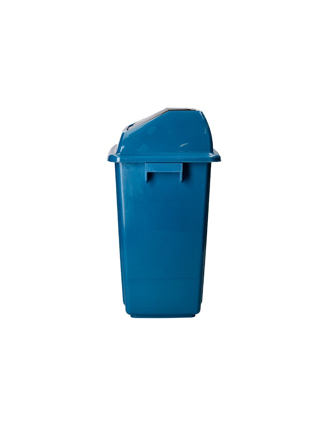 Fabricado en plástico resistente. Tapa de balancín, con 2 asas para facilitar el transporte. Capacidad 58 litros. Color azul. Medidas 470x330x760 mm.
