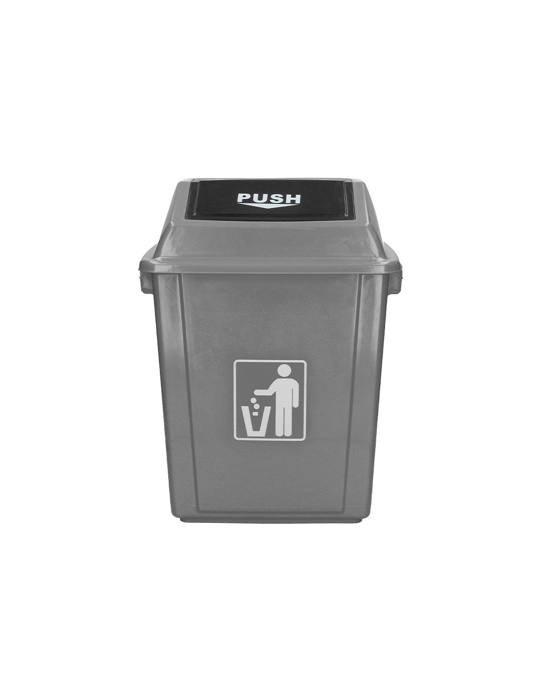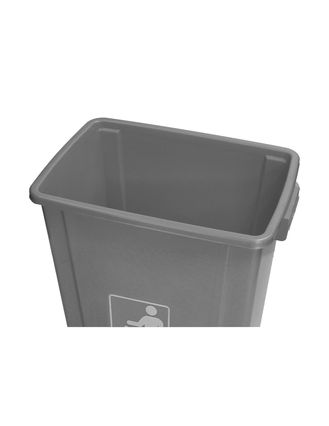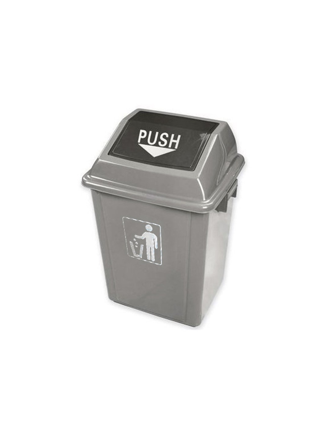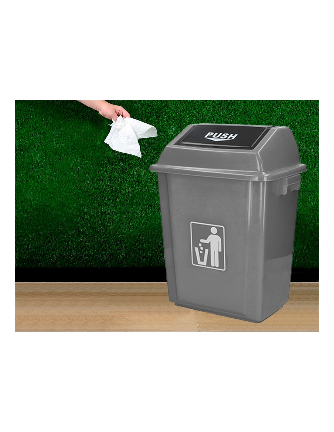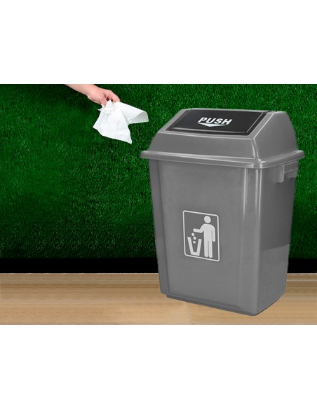 Con tapa balancín. Fácil apertura para retirar la bolsa. 2 asas para facilitar el transporte. Fabricada en plástico. Resistente. Color gris.