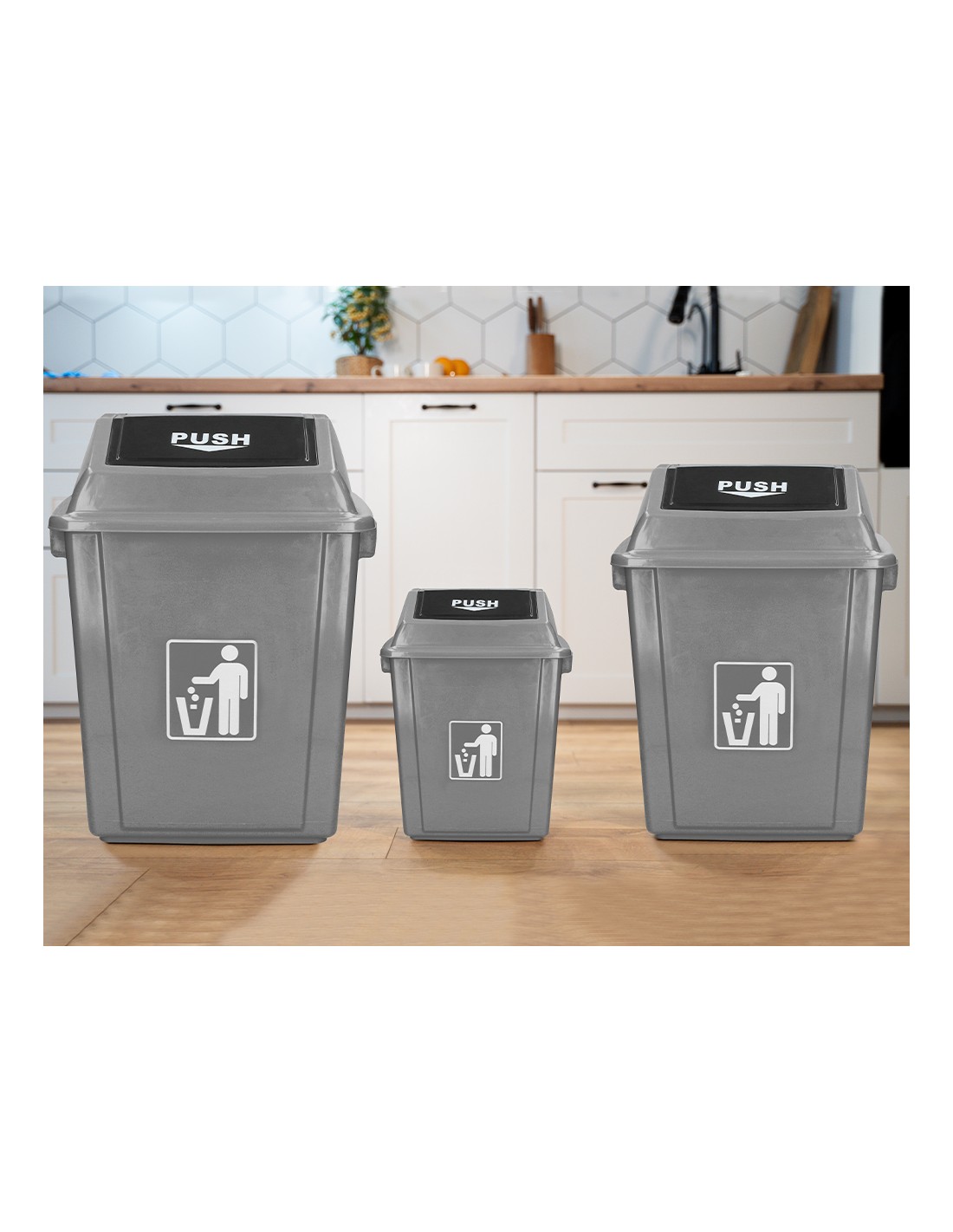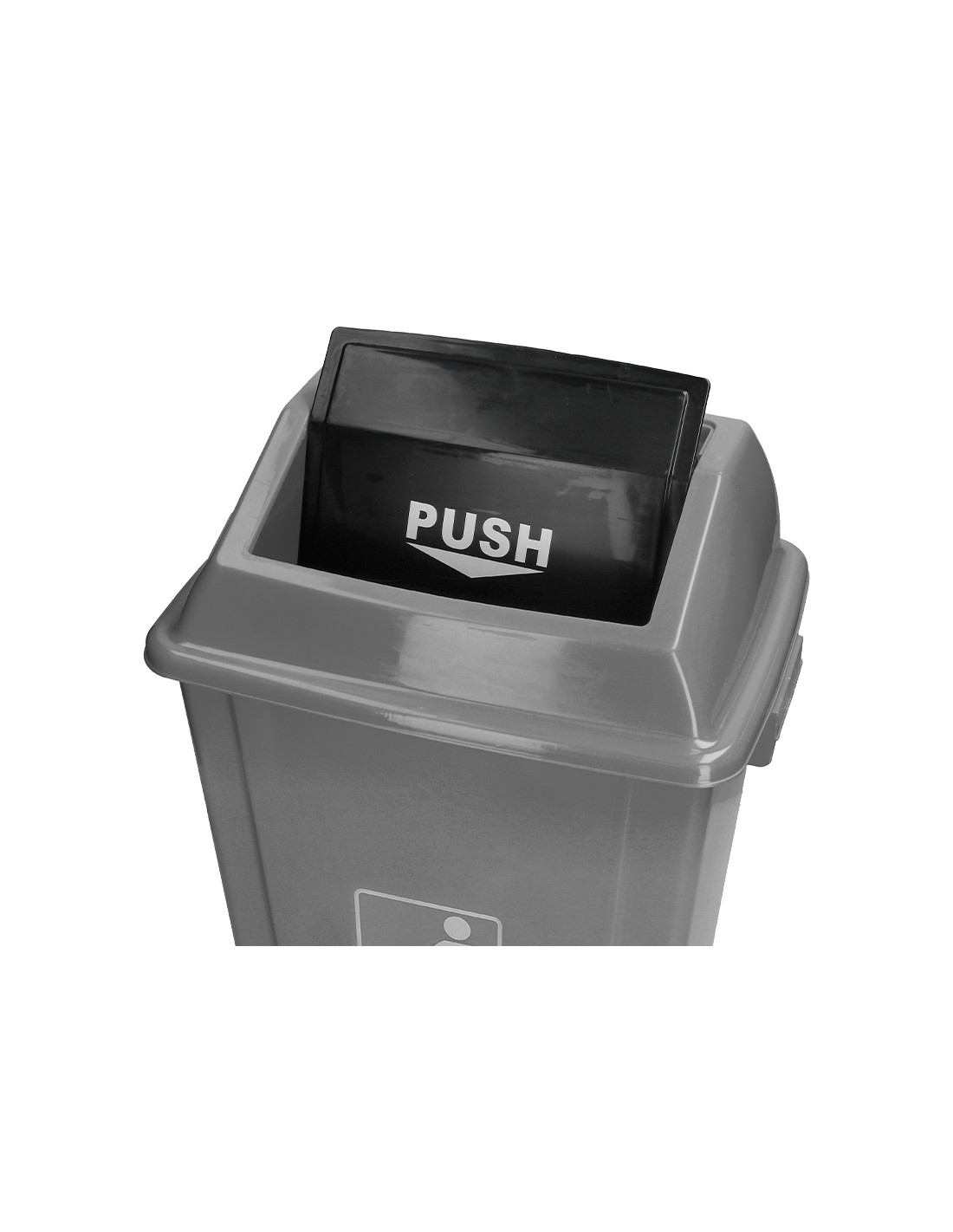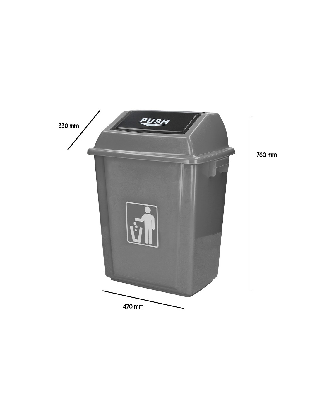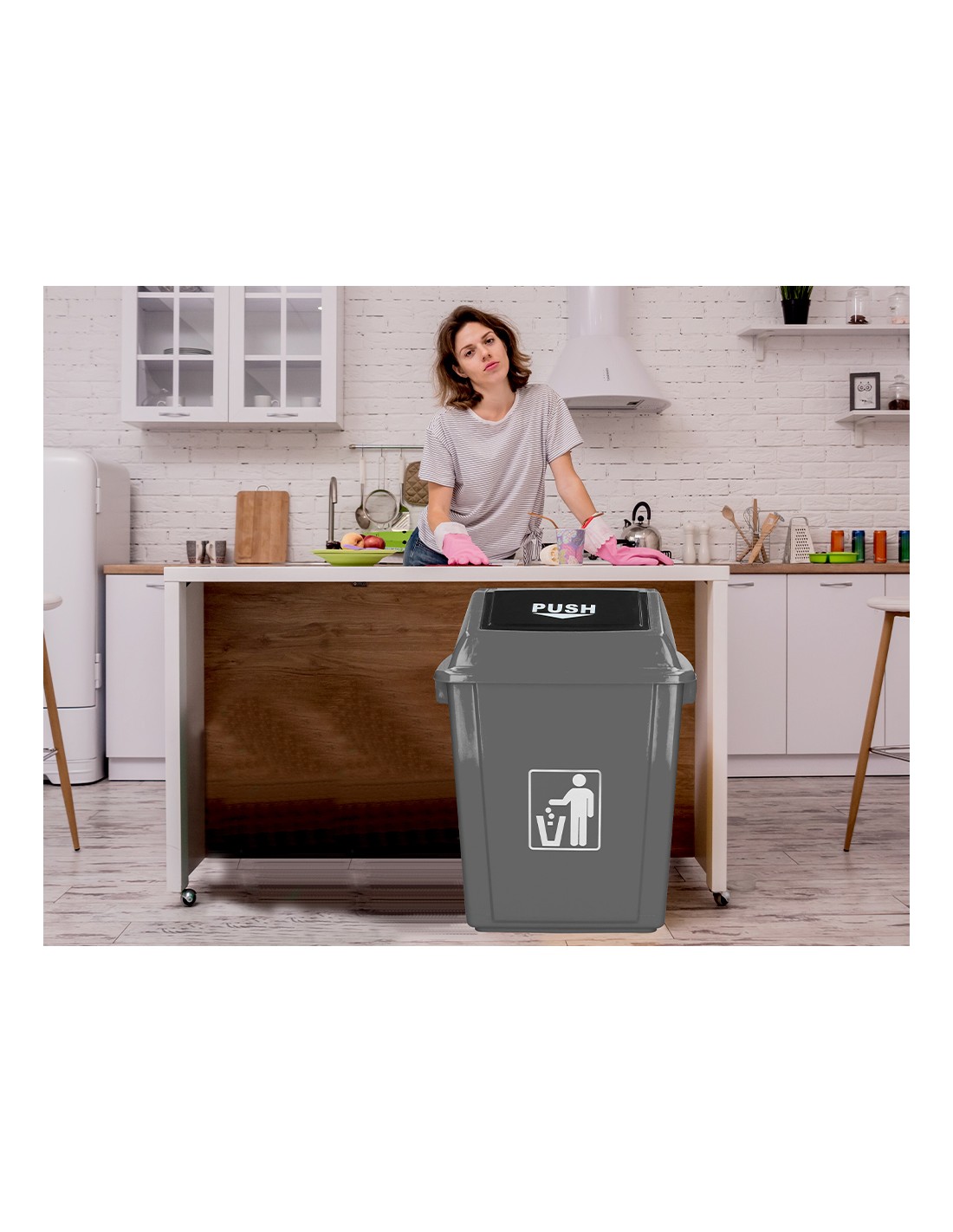Con tapa balancín. Fácil apertura para retirar la bolsa. 2 asas para facilitar el transporte. Fabricada en plástico. Resistente. Color gris.