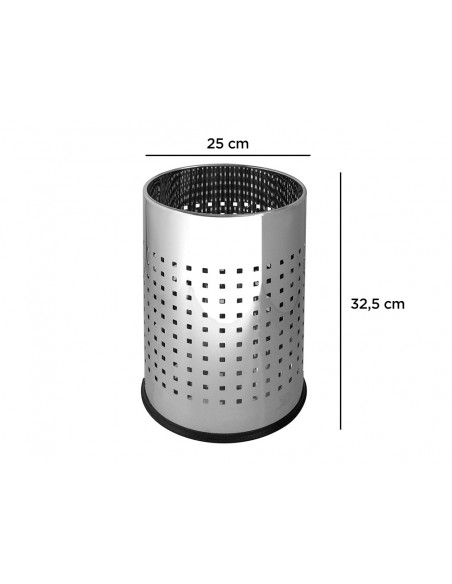 Papelera metálica con forma redonda. Aro inferior fabricado en PVC. Acabado cromado. Perforada. Capacidad 12 litros. Medidas Ø 25 x 32,5 cm.