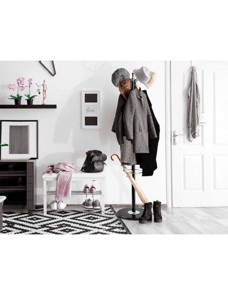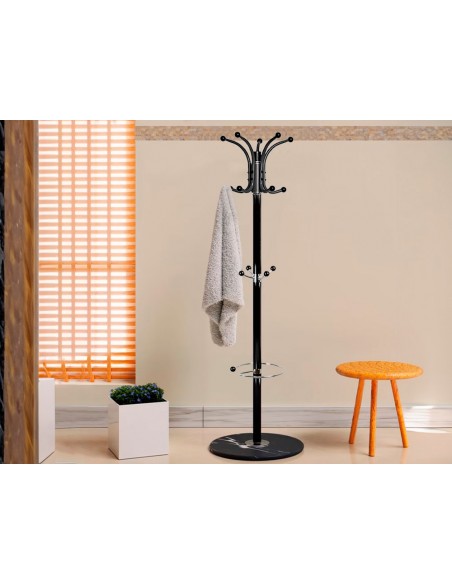Perchero metálico con base redonda que proporciona mayor estabilidad. Con 10 colgadores, paragüero y ganchos portabolso. Con acabado redondeado para proteger las prendas de ropa. Medidas Ø 40 x 174 cm.