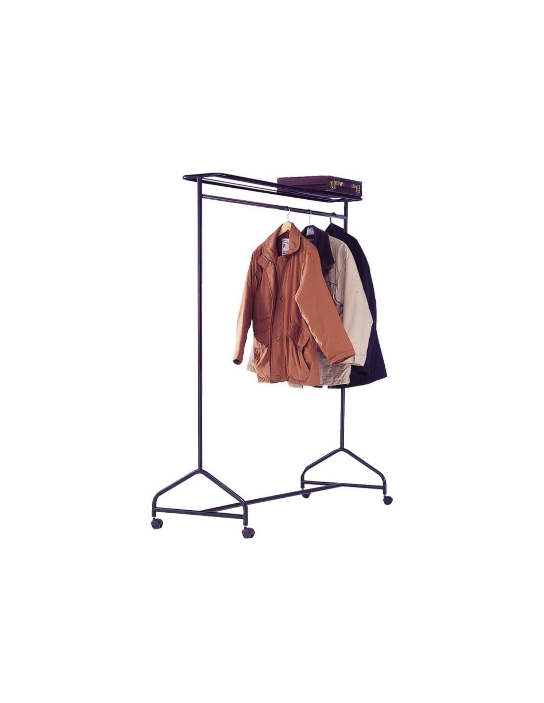 Perchero vestidor portátil con ruedas y con repisa superior para soporte de ropa y objetos. Pintado en epoxi. Con capacidad para 40 perchas. Medidas 150 x 170 x 55 cm.