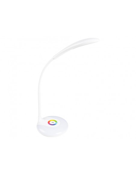 Lámpara de mesa o escritorio inalámbrica con batería recargable fabricada en ABS. Esta lámpara está especialmente diseñada para iluminar sin dañar la visión de los niños. Los leds de colores permiten crear diferentes ambientes, cada color se adapta a una situación descansar, leer o estudiar. El brazo es inclinable para ajustar la difusión de la luz. Interruptor táctil. Con 3 niveles de brillo. Ahorro de energía. Potencia 5W. Cable para cargar incluido. Color blanco. Medidas 133 x 209 x 137 mm.