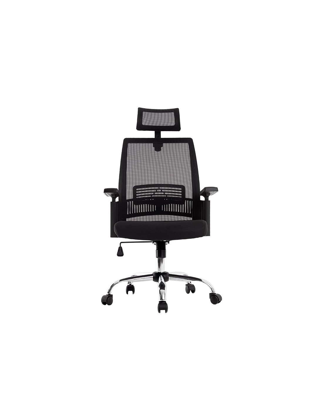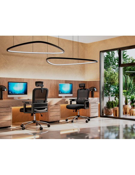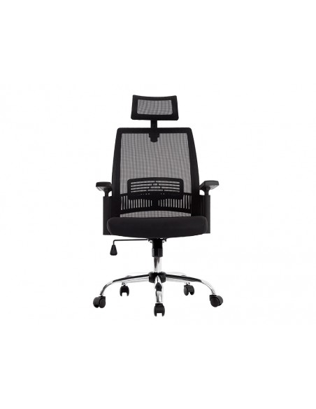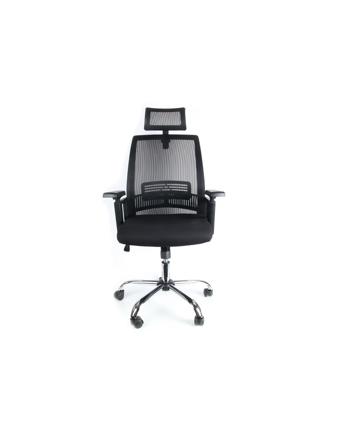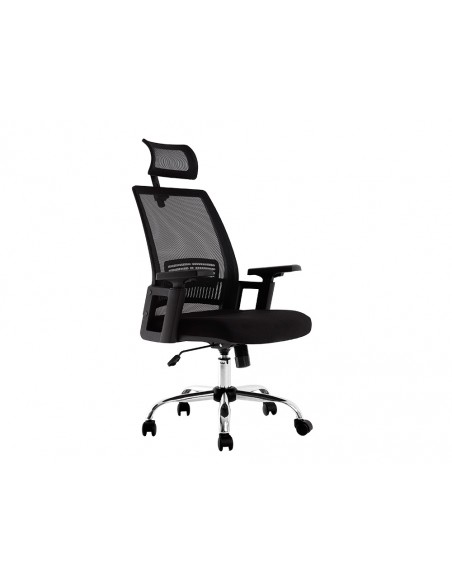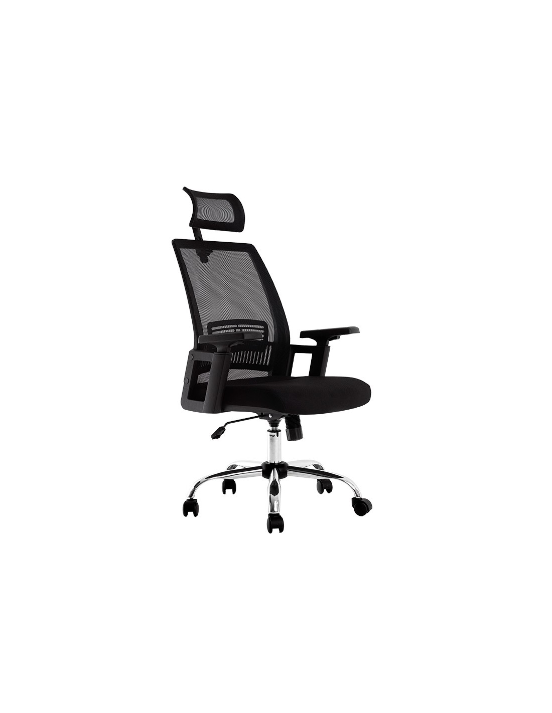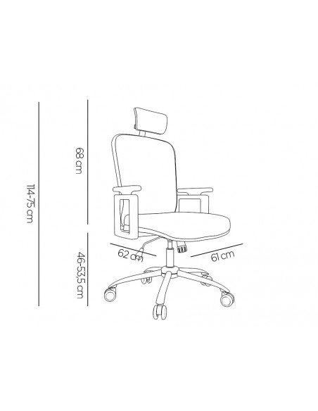 Silla ergonómica giratoria 360°. Asiento y respaldo En malla y tejido de color negro. Con apoyo lumbar y reposacabezas. Pistón de gas de 7 cm. Base metálica resistente. Altura de la silla 114 + 7,5 cm. Altura del respaldo 68 cm. Altura del asiento 46-53,5 cm. Ancho del asiento 61 cm. Profundidad del asiento 62 cm. Brazos ajustables en altura, de polipropileno. Ruedas nylon de 6 cm Ø. Horas de uso 8 horas. Peso de la silla / peso máximo soportado 17 kg / 130 kg.