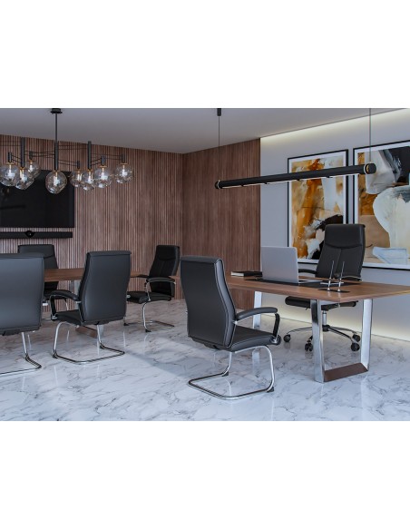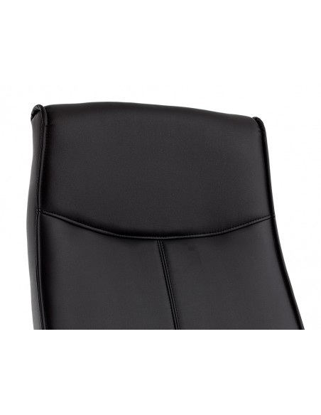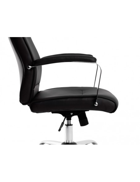 Silla de dirección con diseño fino y sofisticado tapizada de simil piel encolor negro, perfecta para añadir un toque de elegancia a cualquier espac io. Ofrece una combinación de comodidad y estilo. Tiene un diseño cuidado al detalle, con unos brazos acolchados con base metálica cromada brindan un soporte adicional y un aspecto moderno y atractivo. La silla cuenta con un mecanismo de mariposa que permite ajustar fácilmente la altura y la inclinación del asiento, adaptándose a tus preferencias y necesidades de confort. Gracias al gaslift de 80 mm cromado, podrás ajustar la altura de la silla con suavidad y precisión. La base cromada de 350 mm proporciona estabilidad y resistencia, asegurando que la silla se mantenga firme y segura durante su uso. Equipada con ruedas premium, ofrece una movilidad suave, permitiéndote desplazarte sin esfuerzo por tu espacio de trabajo de forma silenciosa. Las ruedas están especialmente diseñadas con un recubrimiento de nylon que evita arañazos y protege e