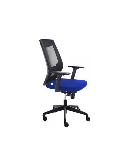 Silla rocada de oficina con brazos tapizada en tela ignifuga azul y respaldo en polimero negro