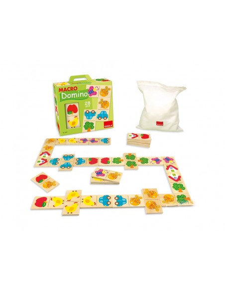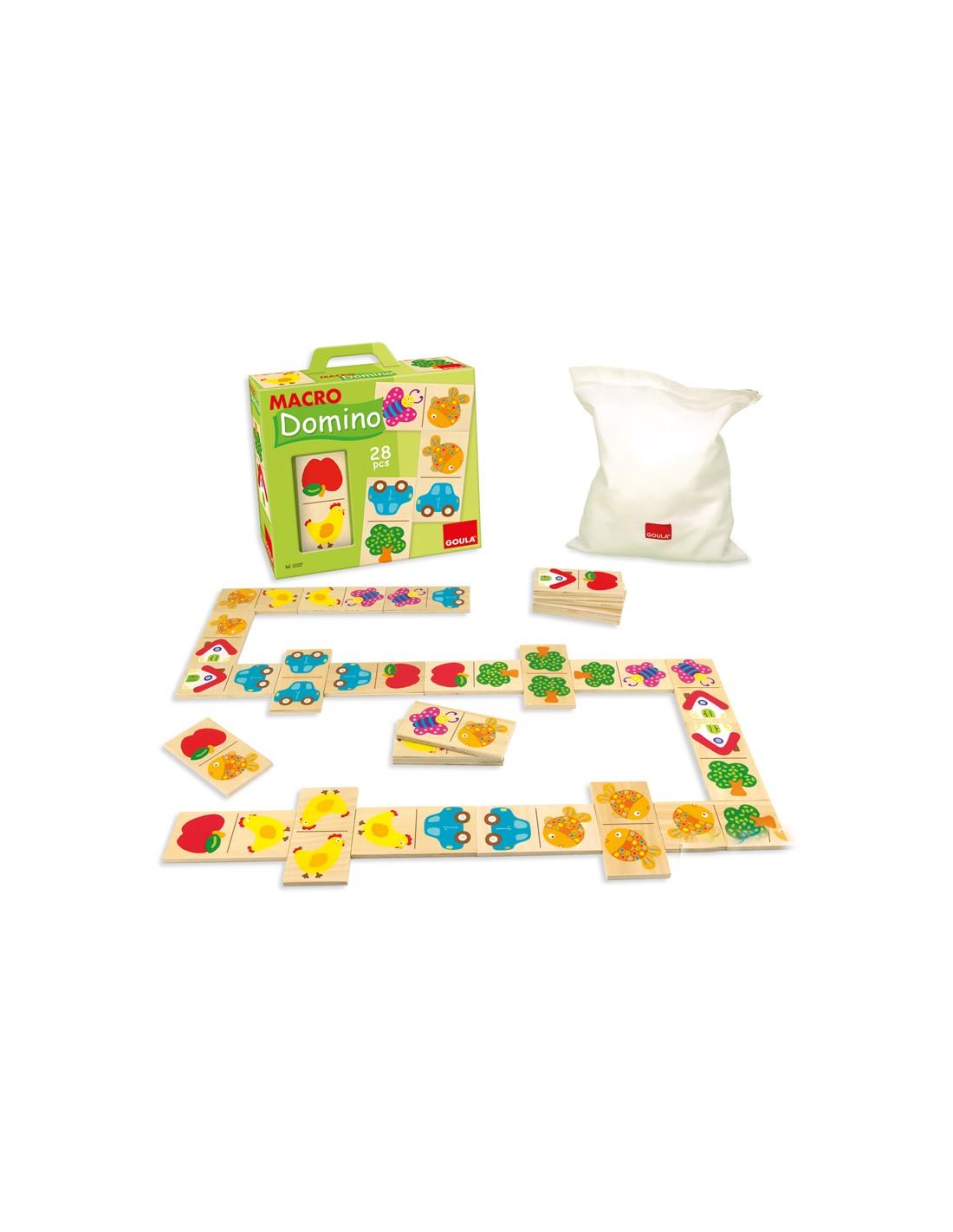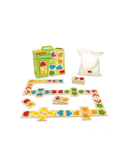 Tradicional dominó de 28 piezas de madera de 12 x 6 cm. Serigrafiadas. Caja con ventana y bolsita para guardar las piezas. A partir de 1 año. 1 o más jugadores. Medidas 25,5 x 16,4 x 7,5 cm.