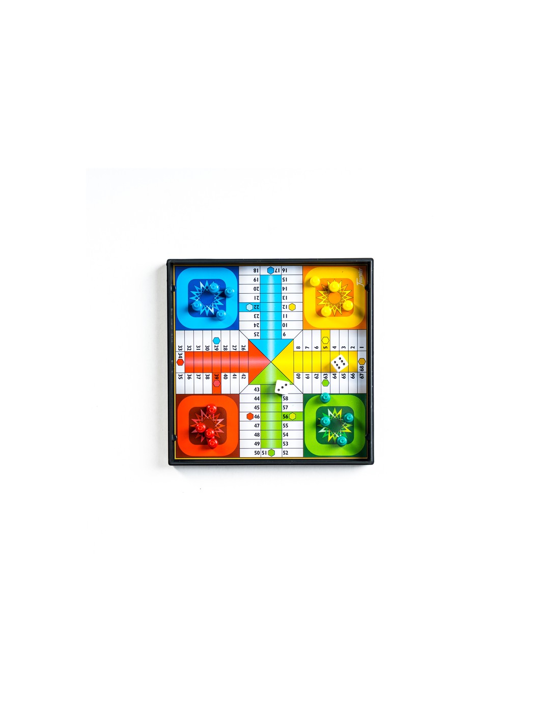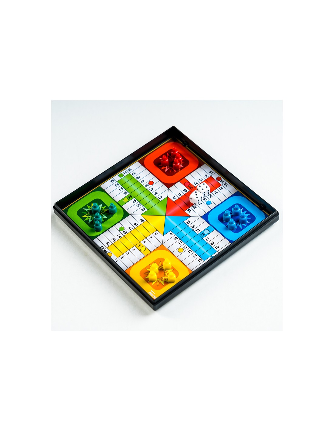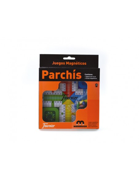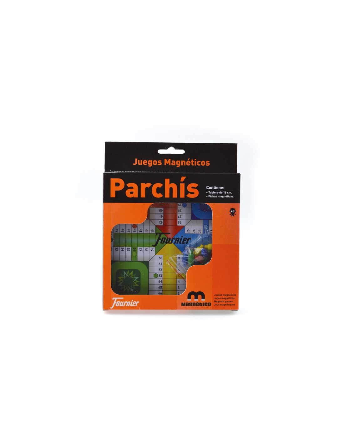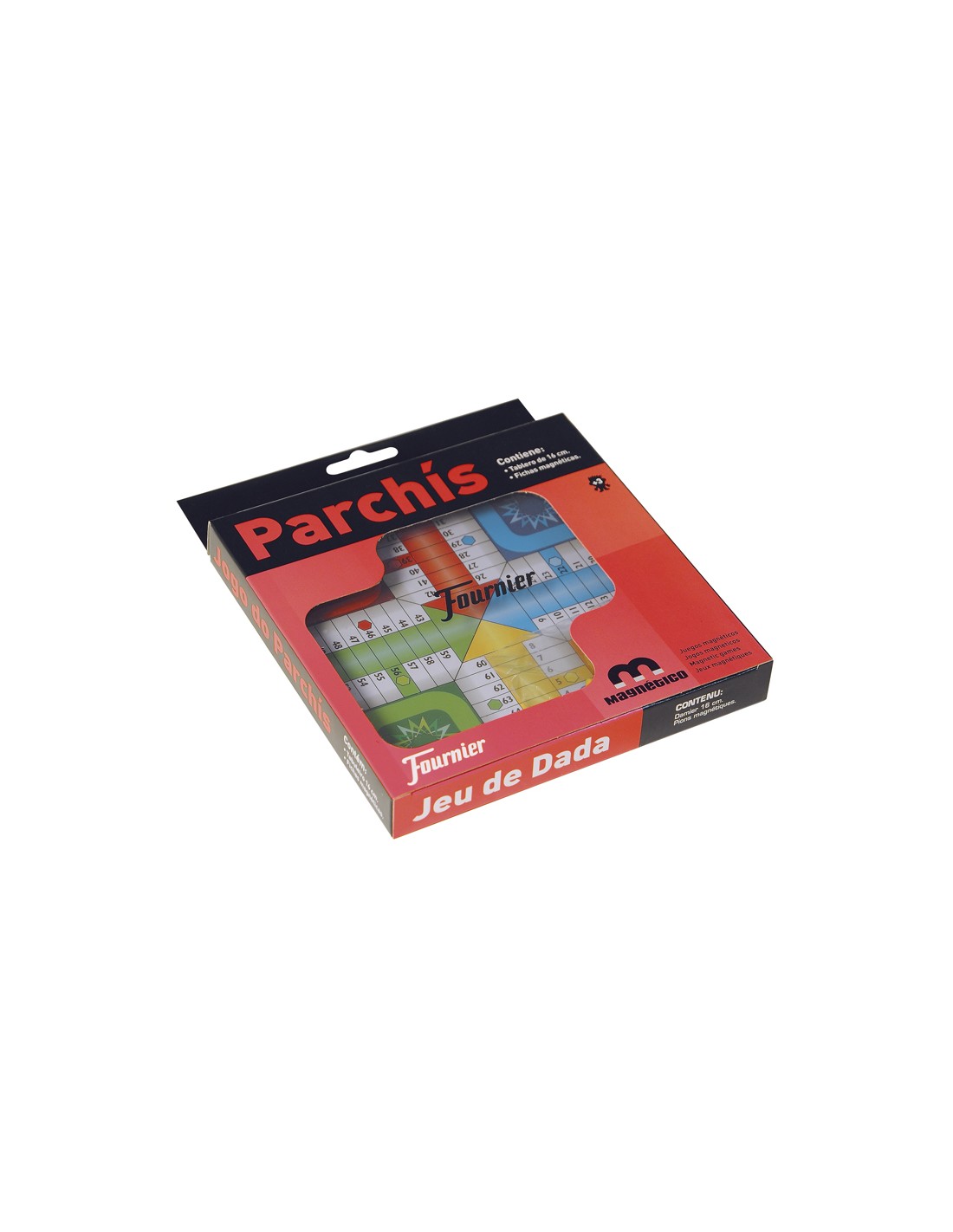 Juego de parchís para 4 jugadores. Contiene tablero, 4 cubiletes, 4 dados y 16 fichas magnéticas. Medidas 160 x 160 mm.