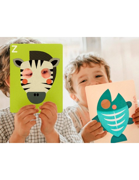 Divertido juego de interacción familiar. Aprende el abecedario en inglés, con estas 26 tarjetas faciales interactivas.