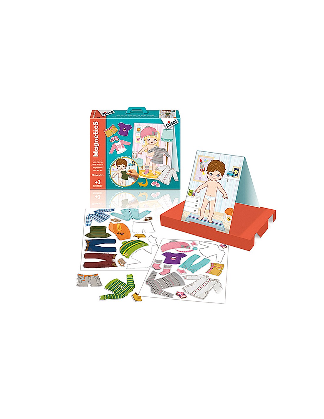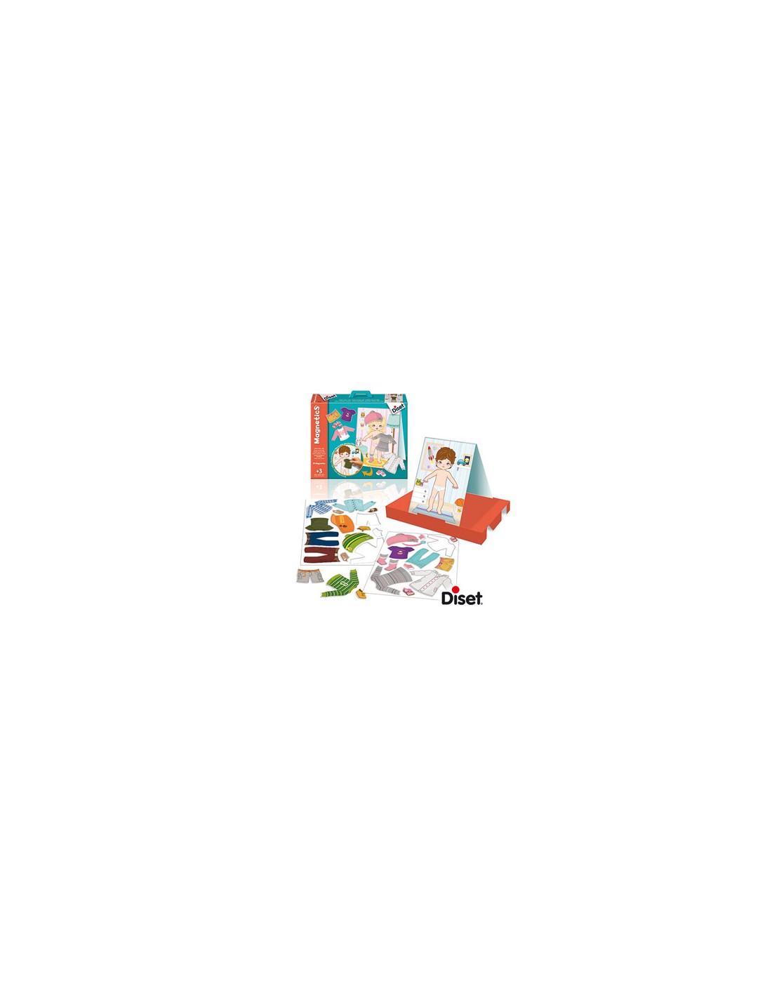 Juego magnético para niños y niñas. Consiste en combinar las diferentes piezas magnéticas para vestir al niño y a la niña con diferentes conjuntos. Los niños aprenden a reconocer las diferentes prendas de ropa y ponerlas en la parte del cuerpo adecuada y a diferenciar ropas de verano/invierno Medidas 26,20 x 5,20 cm.