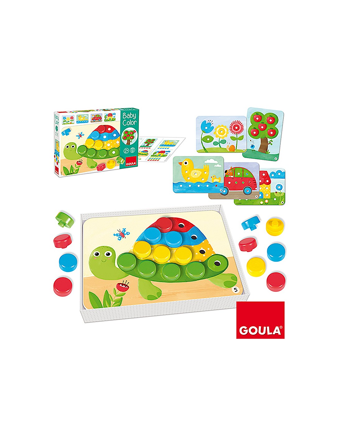 Divertido mosaico de madera para aprender los colores encajando correctamente los pivotes en cada lámina. Pivotes muy gruesos para niños pequeños. Láminas progresivas de menos a más dificultad. Ilustraciones llamativas por su colorido. Aprendizaje de los colores básicos como son el azul, amarillo, rojo y verde. Desarrolla la habilidad manual ojo/mano, la percepción visual y la motricidad fina. 6 láminas de cartón grueso semitroqueladas, 20 pivotes en madera de colores y 1 lámina de ejemplos. A partir de 2 años. Medidas 22 x 30 x 5 cm.