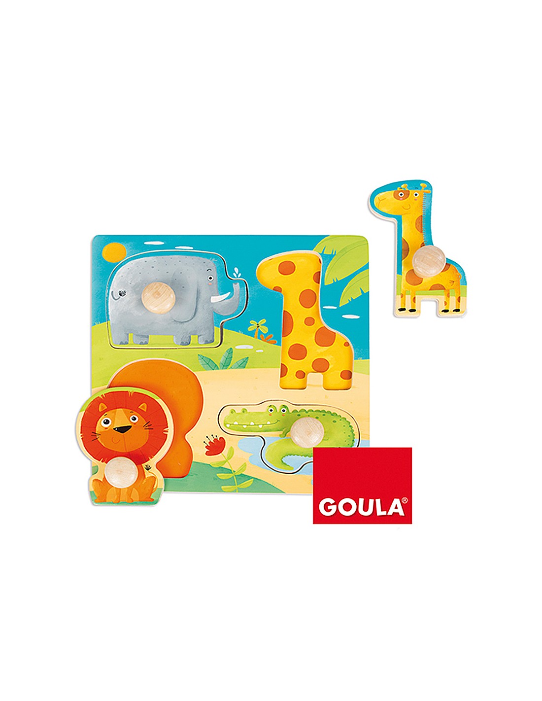 Original puzle de 4 piezas de madera para los más pequeños. Iniciación al mundo de la selva con cuatro animalitos. Los pivotes son grandes para facilitar el agarre al niño. Desarrolla la coordinación manual ojo/mano. Destreza manual y aprendizaje de los colores. A partir de 1 año. Medidas 22 x 22 x 2,5 cm.