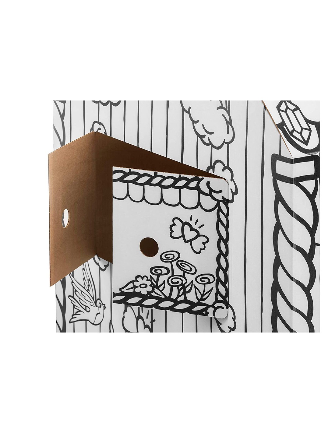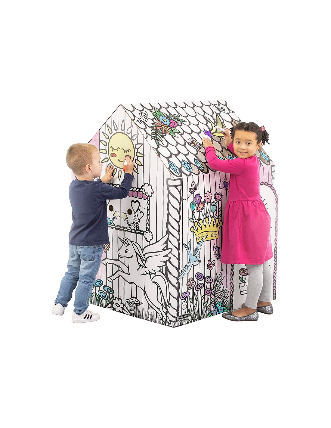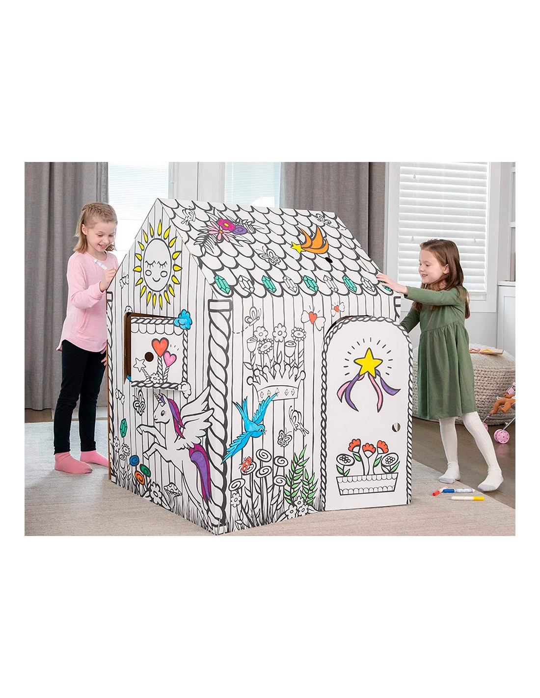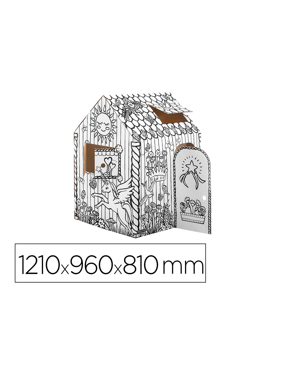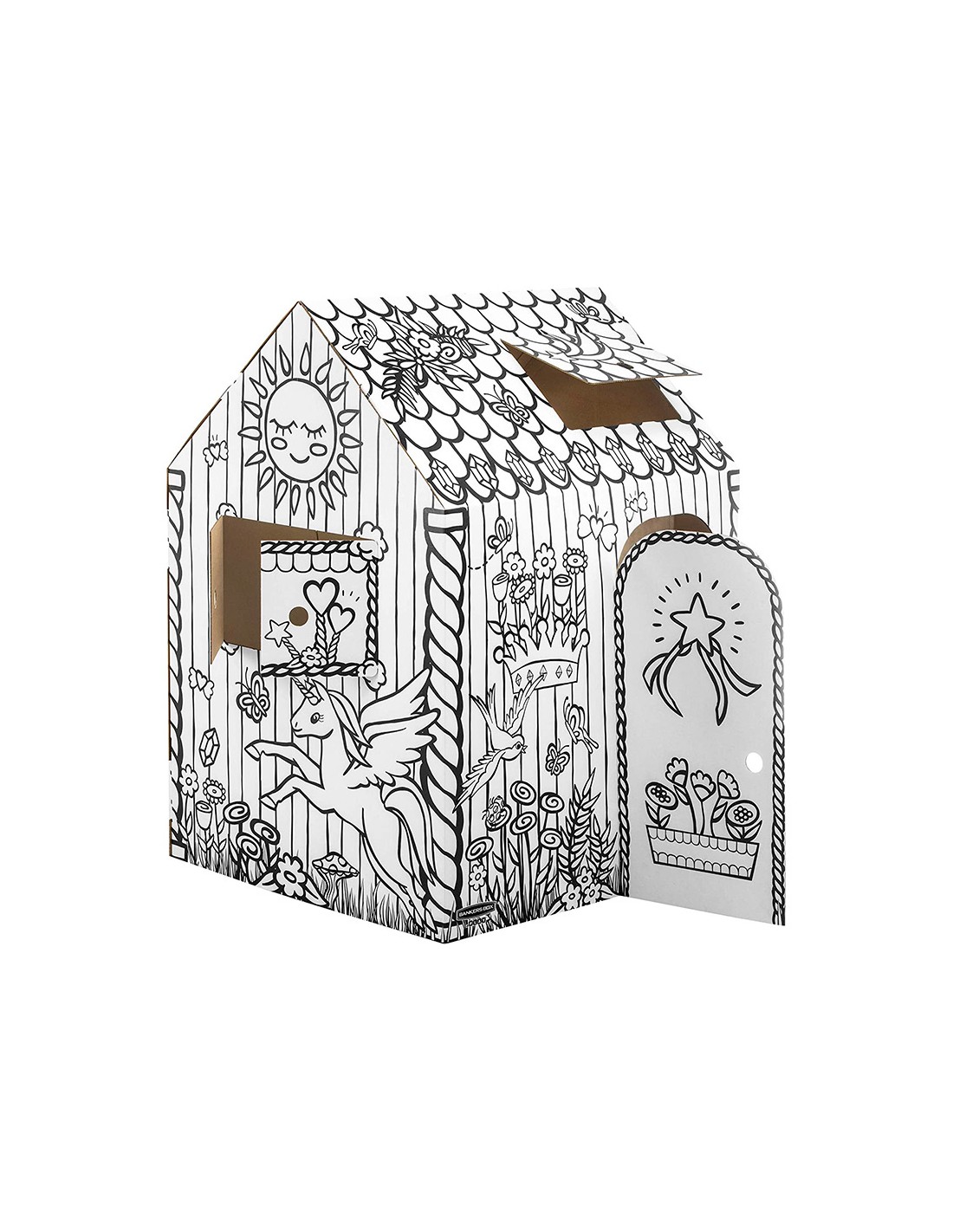 Esta gran casa de juegos para colorear ayuda a fomentar la interacción infantil, el juego imaginativo y colaborativo. Horas de juego para niños, ya que está hecho de cartón corrugado resistente y duradero con bordes redondeados. Rápido de montar, sin necesidad de adhesivos, gracias al ingenioso diseño de 2 piezas. Diseño interactivo y divertido, puedes abrir y cerrar puertas y ventanas. Deje que su hijo exprese su creatividad coloreando el diseño preimpreso (rotuladores/pinturas no incluidos).La casa de juegos, de origen responsable, está hecha de cartón certificado FSC, impresa con tinta no tóxica y se puede reciclar por completo. Medidas completamente ensambladas 121 x 97 x 81 cm.