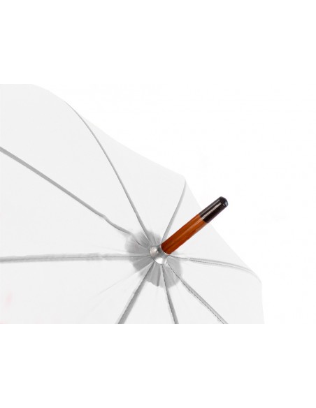 Paraguas de 8 paneles en variada gama de vivos colores. De 105 cm de diámetro, con apertura manual y en resistente material poliéster. Con varillas metálicas en color negro, cierre de velcro y suave mango de madera en color natural. Mango y caña madera. Color blanco.