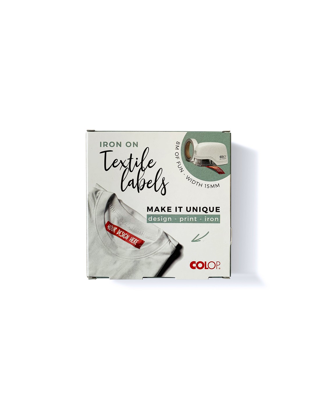 Cinta textil de tafetán termo-adhesiva para mini impresoras Colop E-Mark. Medidas 8 m x 15 mm.