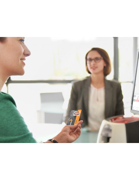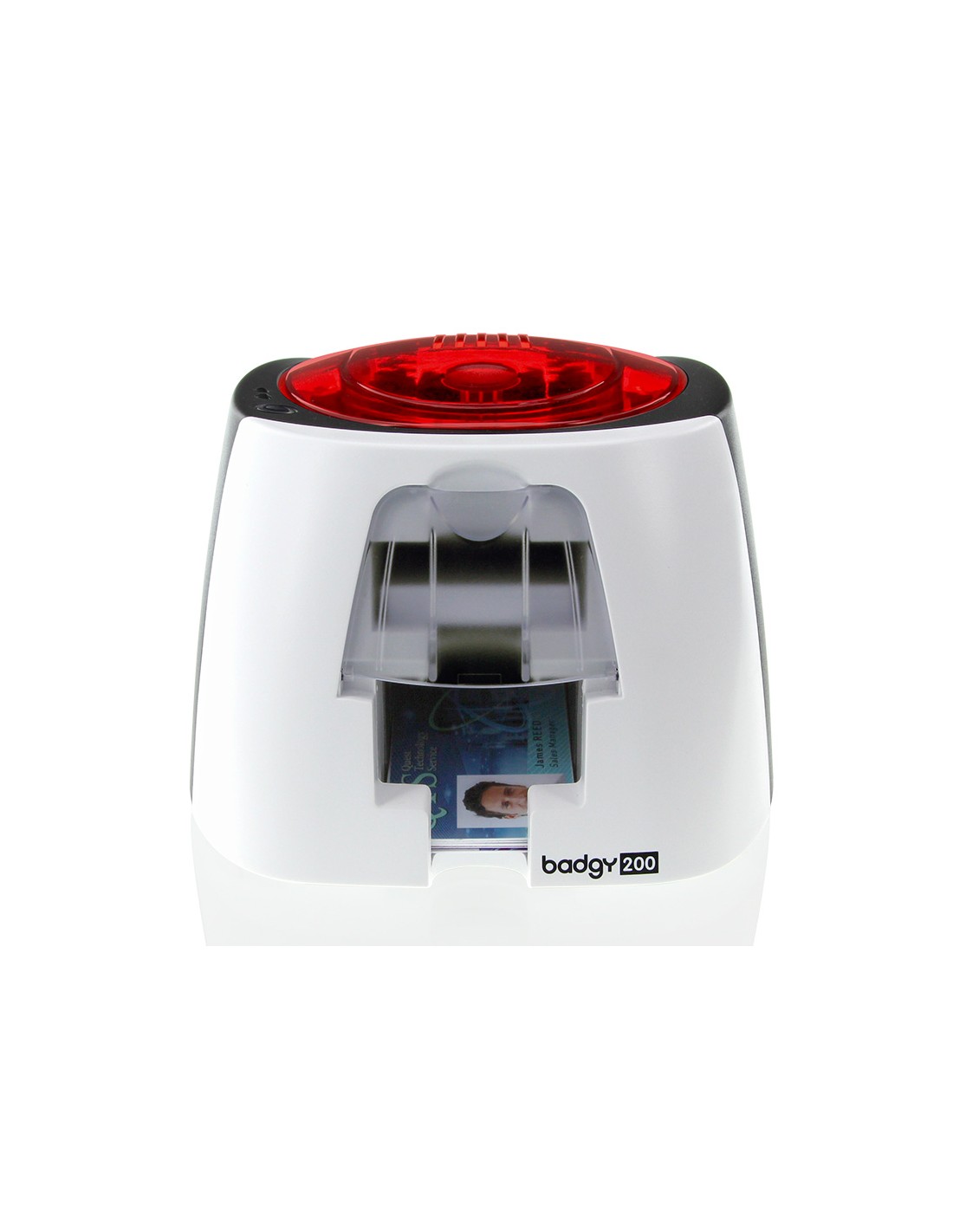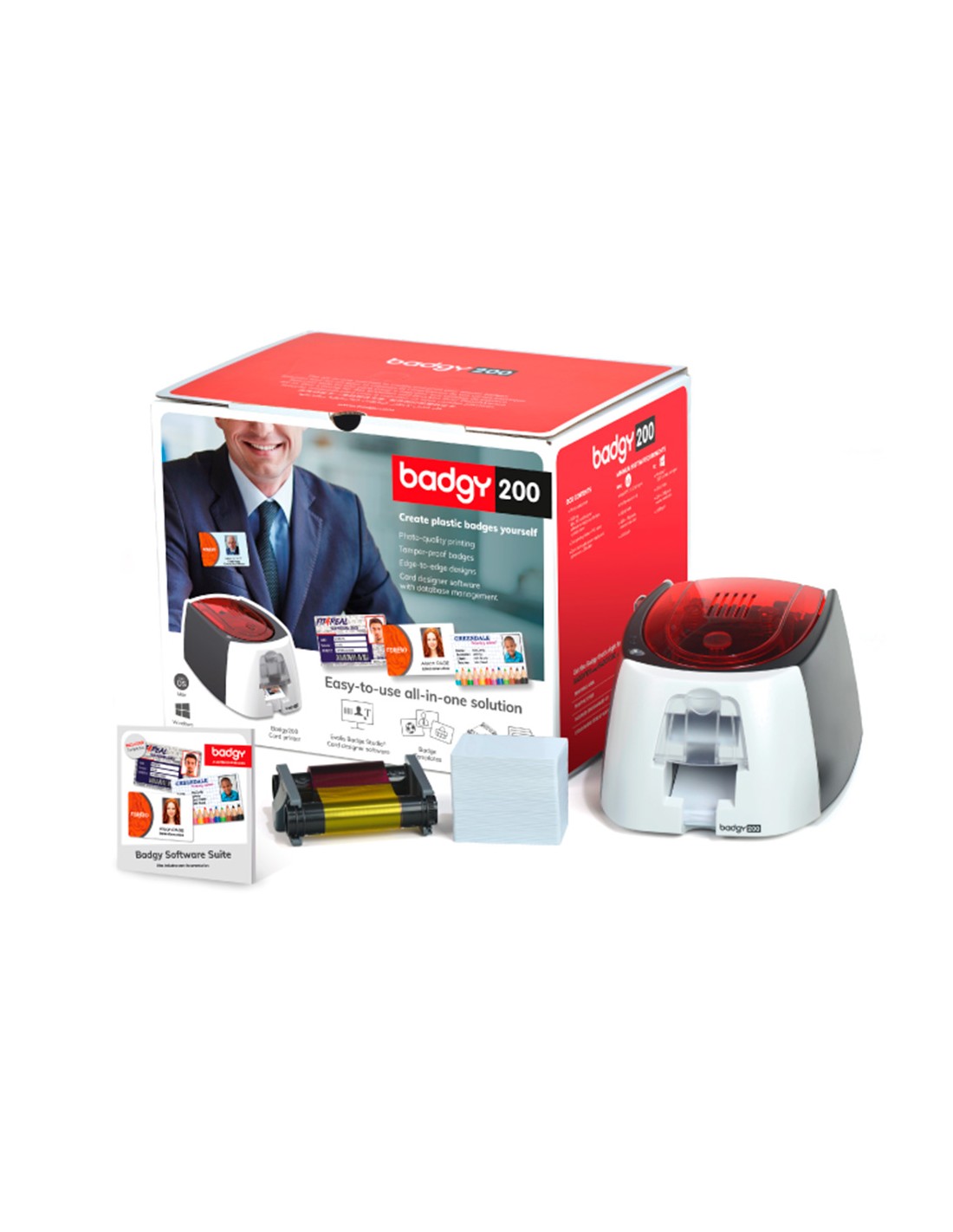 Badgy200 le permite imprimir rápidamente tarjetas de identificación personalizadas en pequeños lotes. La versión Plus del software Evolis Badge Studio va incluida con Badgy200. Esta le permitirá importar fácilmente bases de datos y crear una vCard. La solución todo en uno Badgy200 incluye 1 impresora Badgy200, 100 tarjetas blancas de PVC (85,6 x 54 mm), 1 cinta de color para 100 impresiones, 1 software Evolis Badge Studio+ para crear y personalizar las tarjetas. Impresión de borde a borde. Puede imprimir sus tarjetas en 3 pasos en menos de un minuto Descargue o cree su propia plantilla utilizando el software, personalice la plantilla añadiendo sus logotipos, fotos, texto, código de barras e imprima su tarjeta. Funcionalidad vCarCard una única tarjeta de visita para una infinidad de conexiones. Un nuevo formato de tarjeta de visita, con un código QR especialmente diseñado para ser leído por todos los smartphones. Sólo tendrá que escanear el códigso en la tarjeta y los datos de contac
