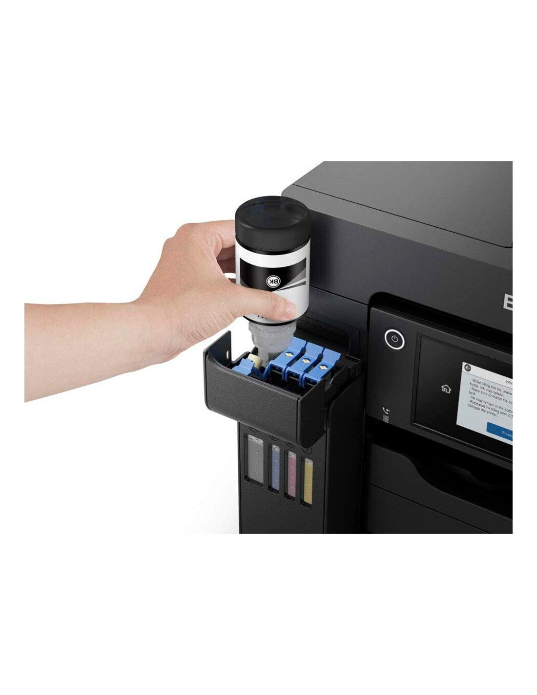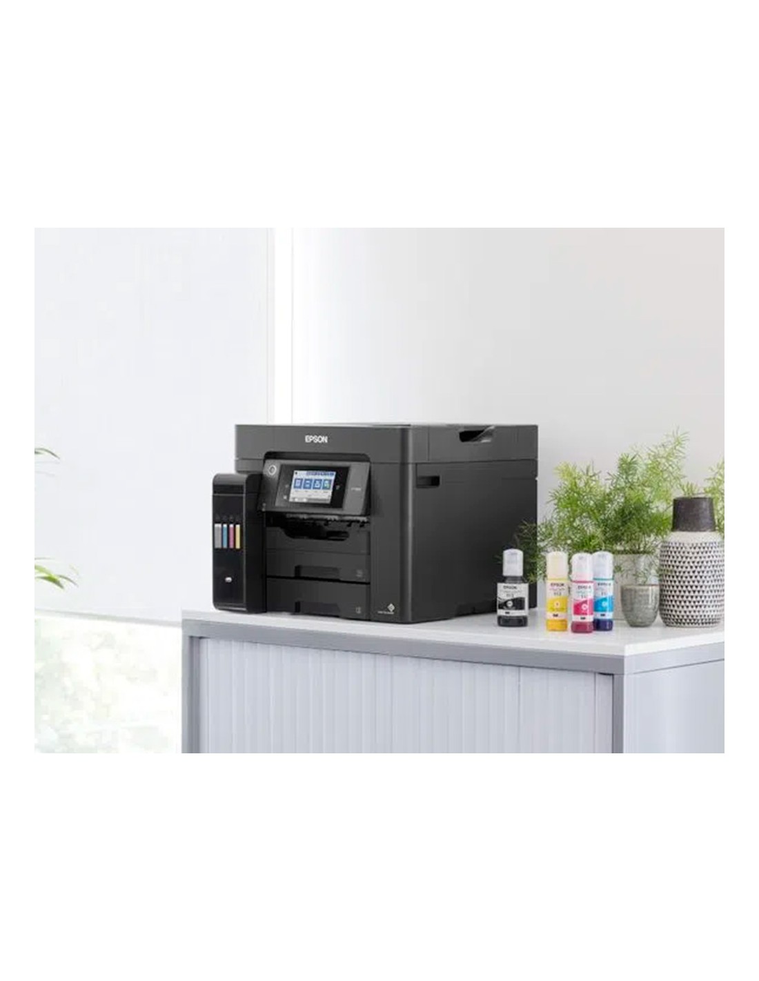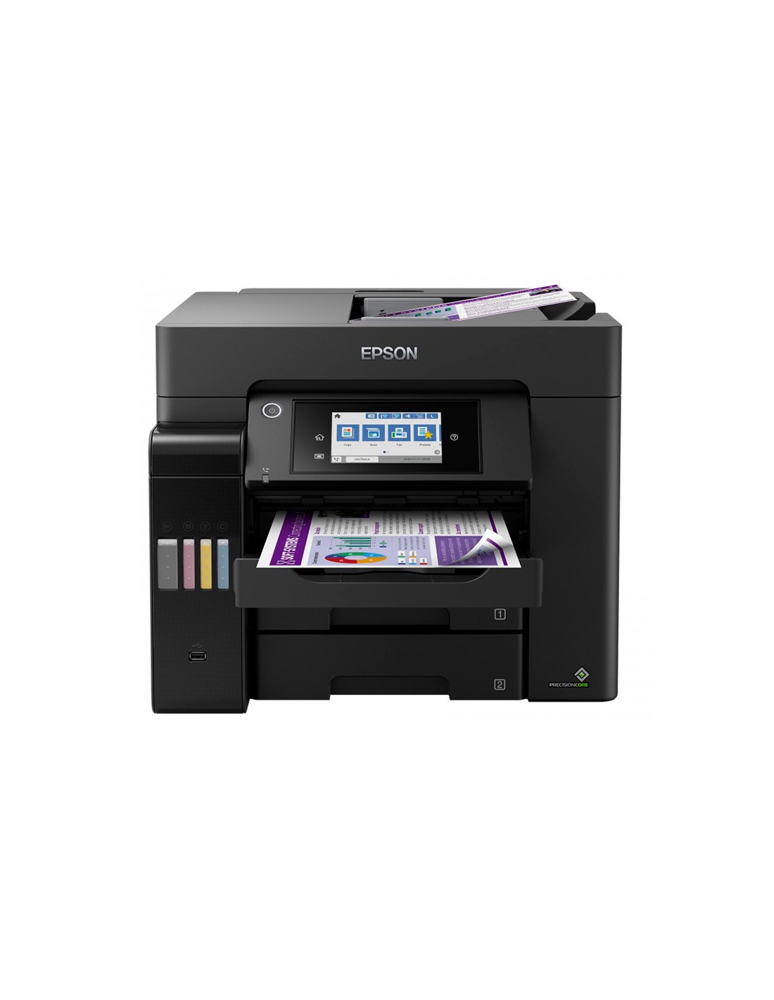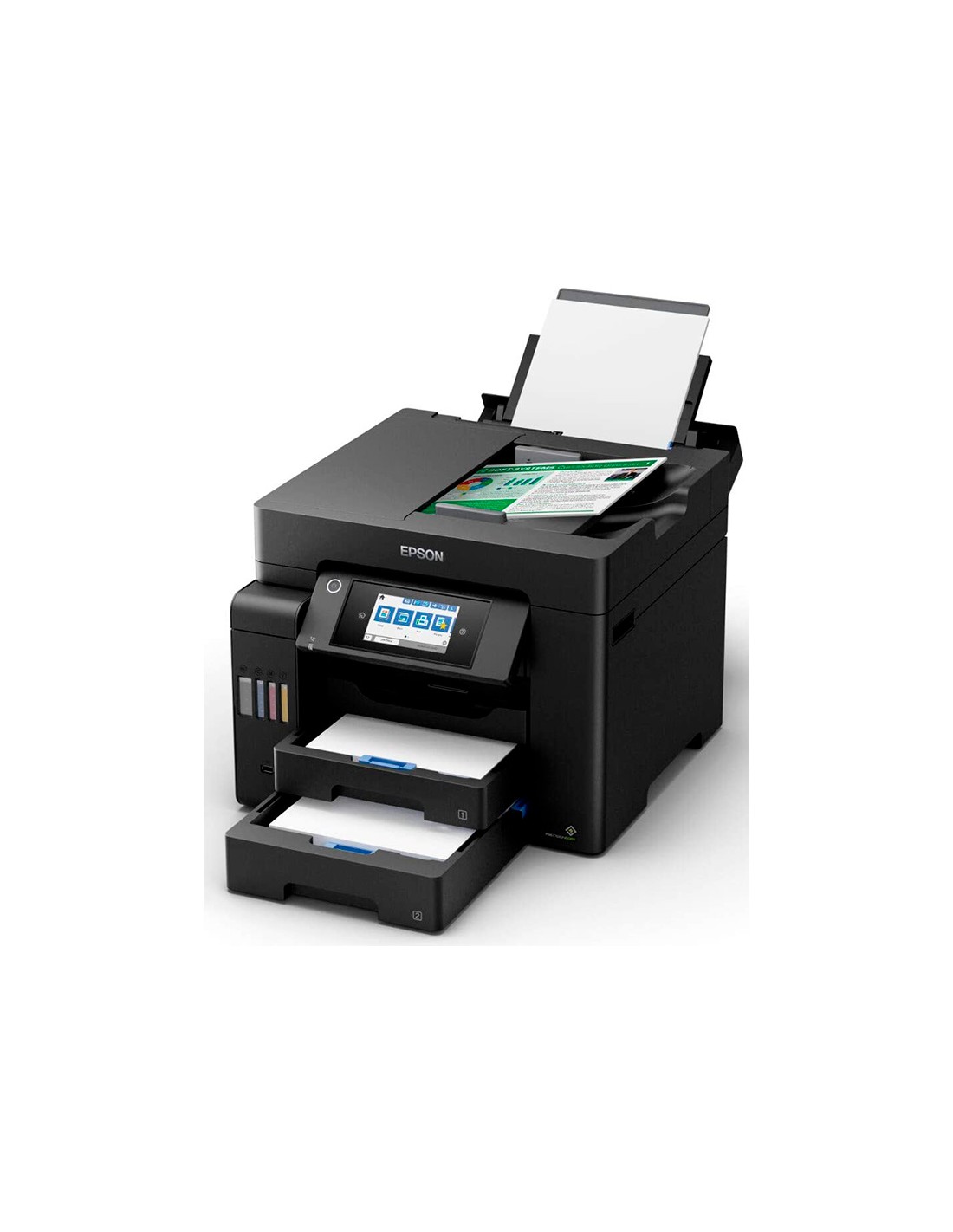 Gran velocidad de impresión y escaneado 25 ipm. Coste por página extraordinariamente bajo. Sistema económico de depósito de tinta. Depósito de tintafrontal fácil de usar. Disfruta de recargas sin problemas con las botella s de tinta mejoradas. Funciones de impresión móvil y conectividad Wi-Fi, Wi-Fi Direct, Ethernet y aplicaciones de impresión para dispositivos móviles gratuitas. Diseñada para empresas. Bandeja frontal de 250 hojas A4, alimentador posterior de 50 hojas, ADF de 50 hojas A4.