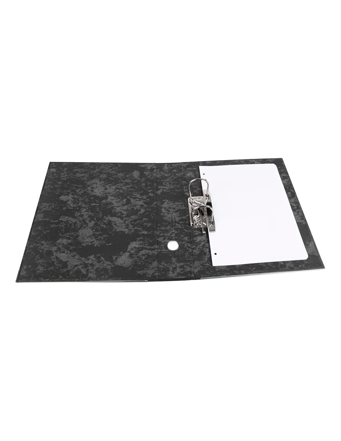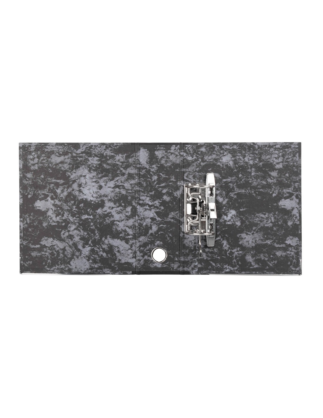 Archivador de cartón entrecolado de 1,9 mm de espesor forrado interior y exterior. Mecanismo de palanca niquelado de 75 mm, compresor metálico, ollao y cantoneras largas. Lomo ancho. Sin índice, cajetín opcional. Ancho de lomo 80 mm.