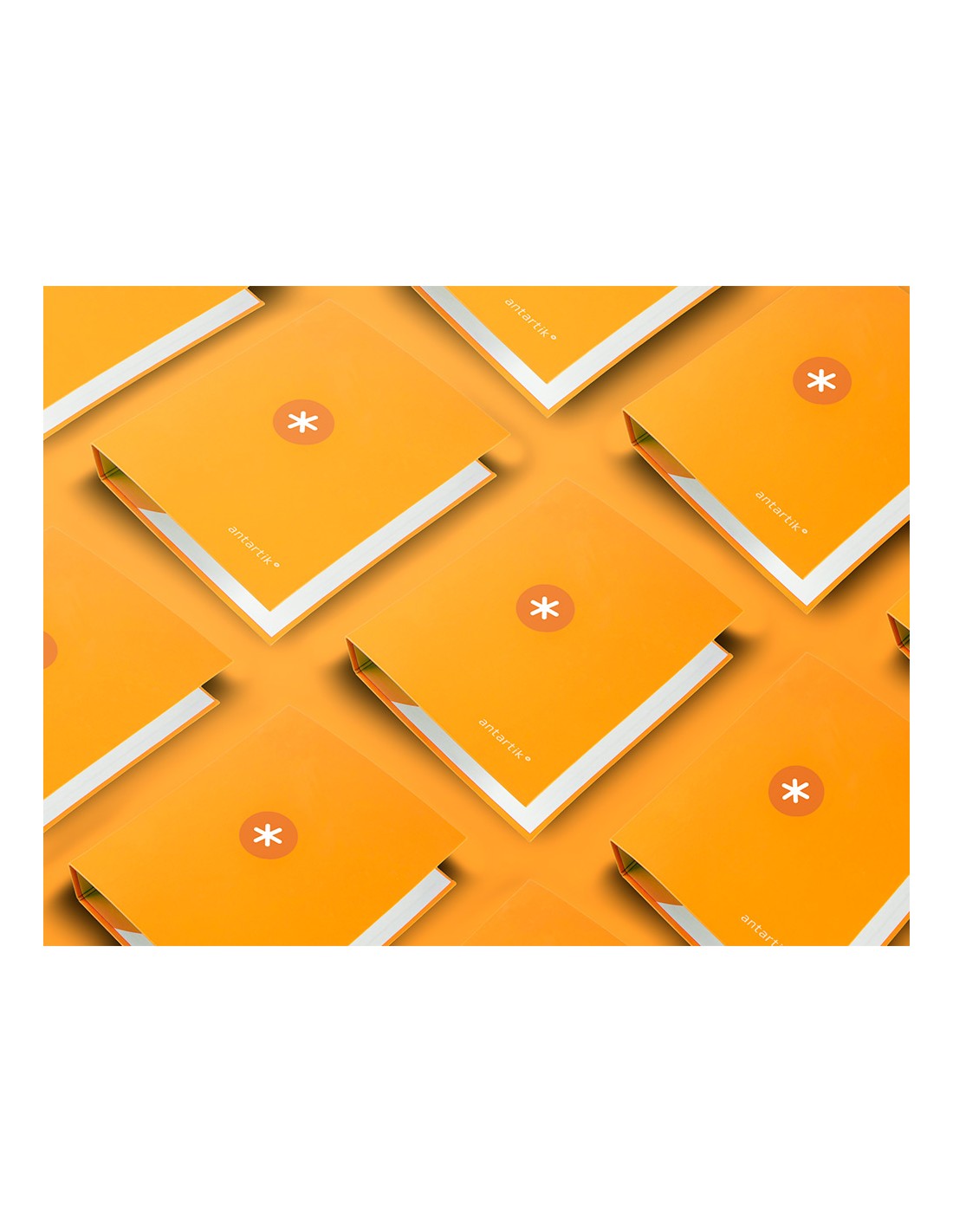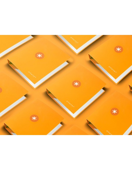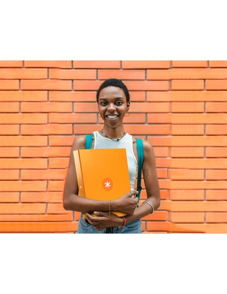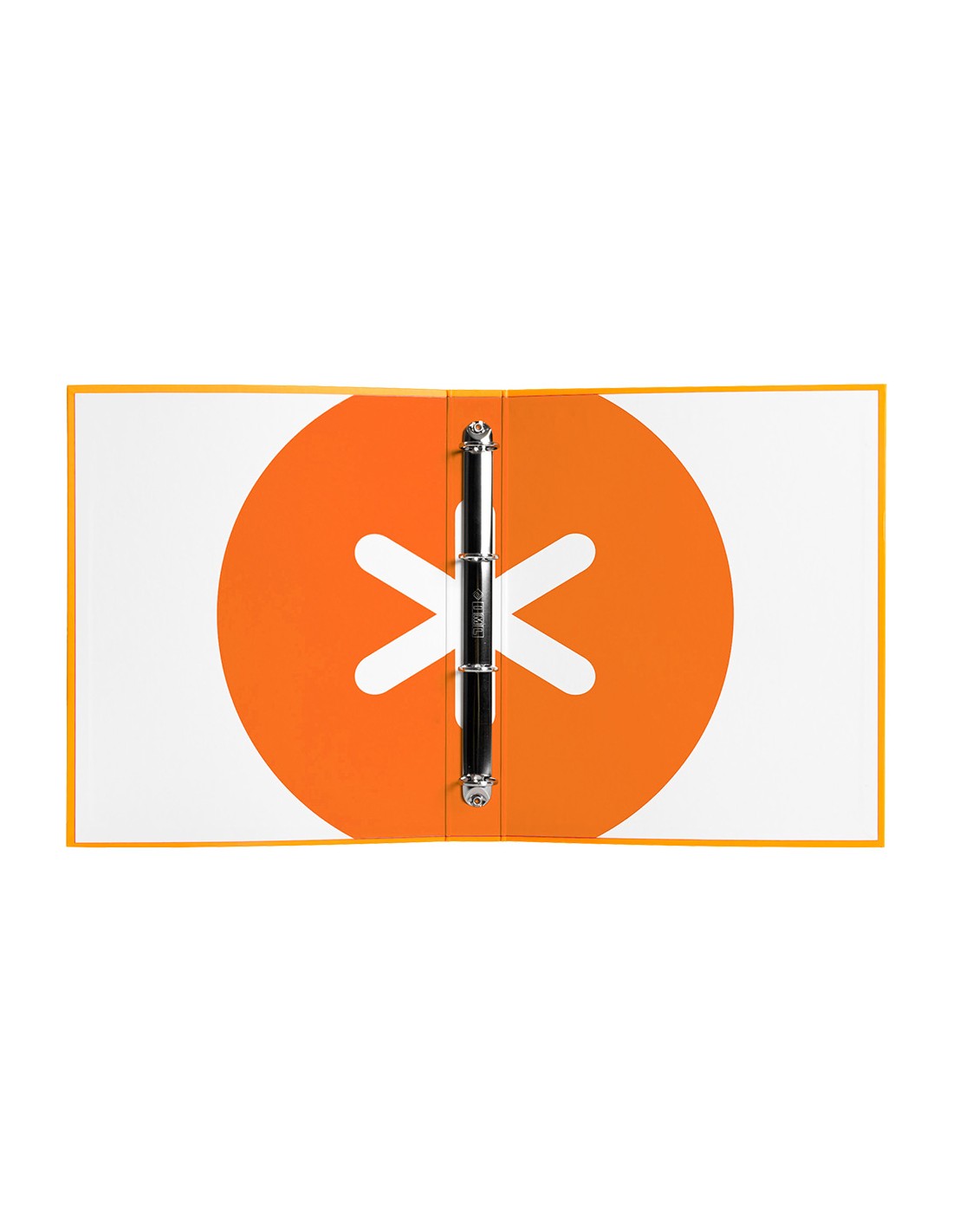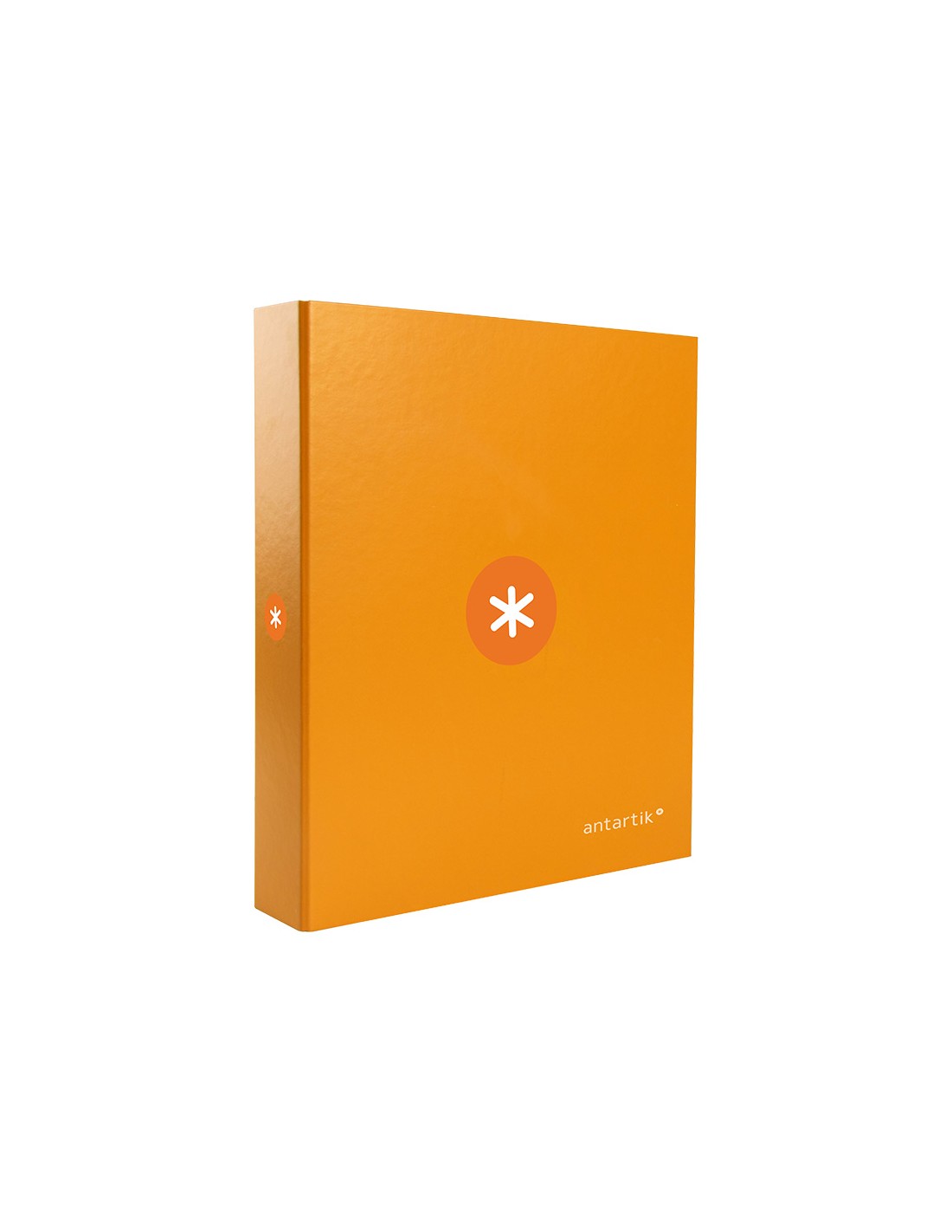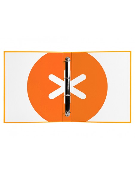 Carpeta fabricada en cartón forrado de 1,5 mm de espesor. Forrada en papel estucado de 135 g/m² impreso. Plastificada mate con detalles en barniz UVI. Con 4 anillas de 40 mm. Guarda interior impresa. Formato DIN A4.