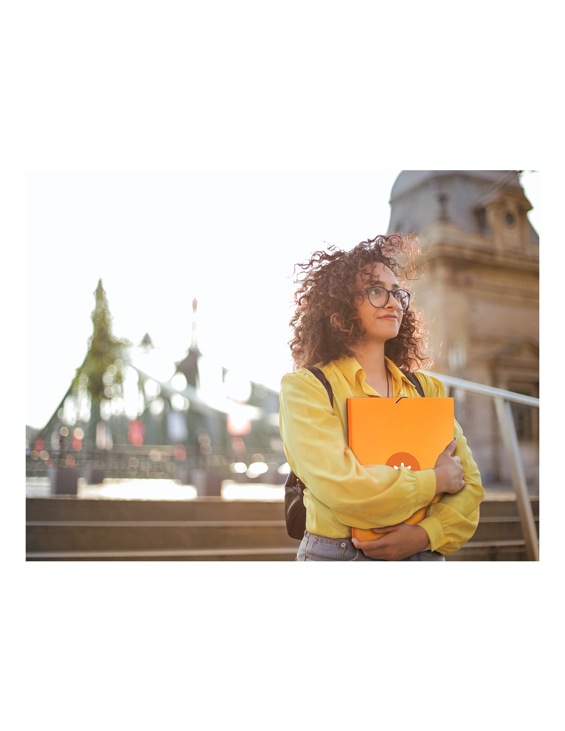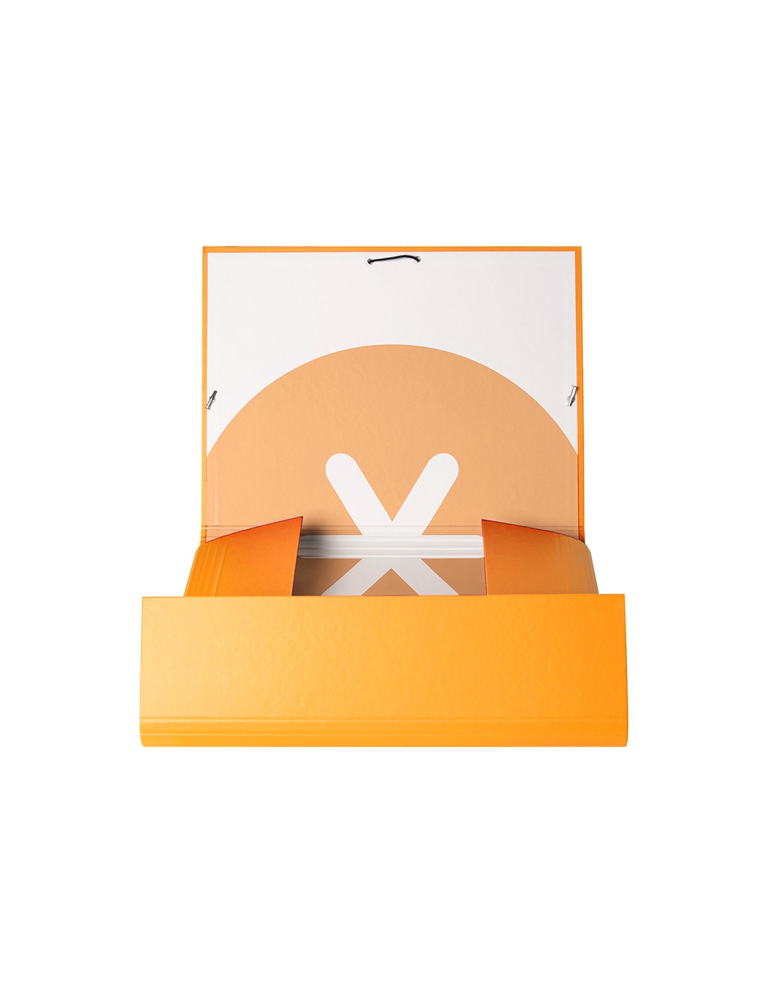 Carpeta de gomas fabricada en cartón forrado de 1,75 mm de espesor. Forrada en papel estucado mate de 135 g/m ²impreso. Plastificada mate con detalles en barniz UVI. Cierre con gomas. Tres solapas. Guarda interior impresa. Formato DIN A4.