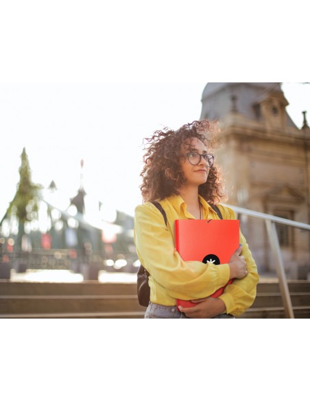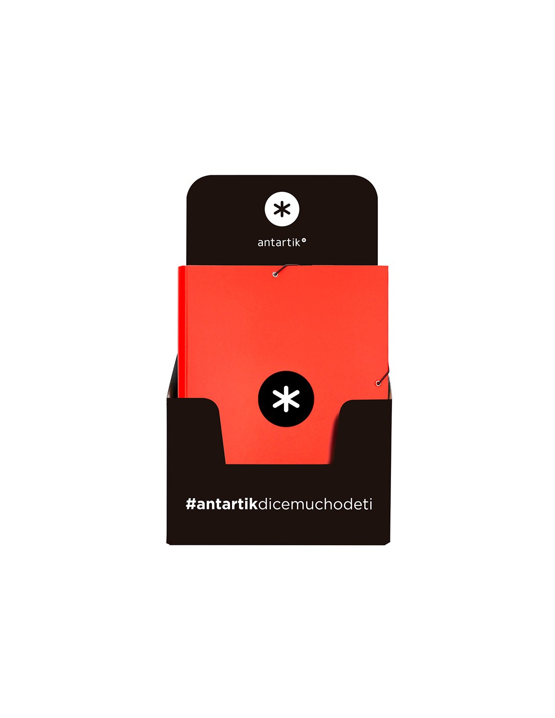 Carpeta de gomas fabricada en cartón forrado de 1,75 mm de espesor. Forrada en papel estucado mate de 135 g/m ²impreso. Plastificada mate con detalles en barniz UVI. Cierre con gomas. Tres solapas. Guarda interior impresa. Formato DIN A4.